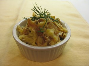 Since we’re on an English topic, I might as well admit that I am the “Queen of the Leftovers.” Sometimes I cook things just to have them available, like the roasted pumpkin that I later turned into soup or the mound of spinach that had been taking up too much room in the refrigerator. Having ingredients around makes me improvise and have fun in the kitchen. Especially on weeknights when I don’t get home from work until 7 or so. This evening worked out unexpectedly well, in less than 30 minutes. I had some leftover braised rutabaga cubes, leftover cabbage that had been tossed in a skillet until browned, several baby yellow potatoes, a couple of cucumbers rescued for 15 cents from the seconds bin at the supermarket, and a wee bit of salmon that I bought just because I craved it for dinner.