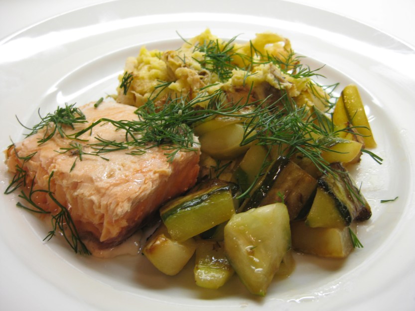 The potatoes were boiled skin-on, mashed with the rutabaga and a little cream to bind them, and combined with the cabbage, which I had re-sautéed briefly and freshened with white wine vinegar. The cucumbers were partially peeled, quartered lengthwise, seeded, cut into triangles, salted and set aside. After about ten minutes, they were dried with a towel and sautéed in oil on medium high heat until browned but still crisp and doused with white wine vinegar. I cooked the salmon filet on the stove (the oven also works fine). The three components were assembled on a plate and sprinkled with fresh dill sprigs that, together with the “pickle,” meaning the vinegar-laced cucumber, cleansed the palate. A great balance. Yum.