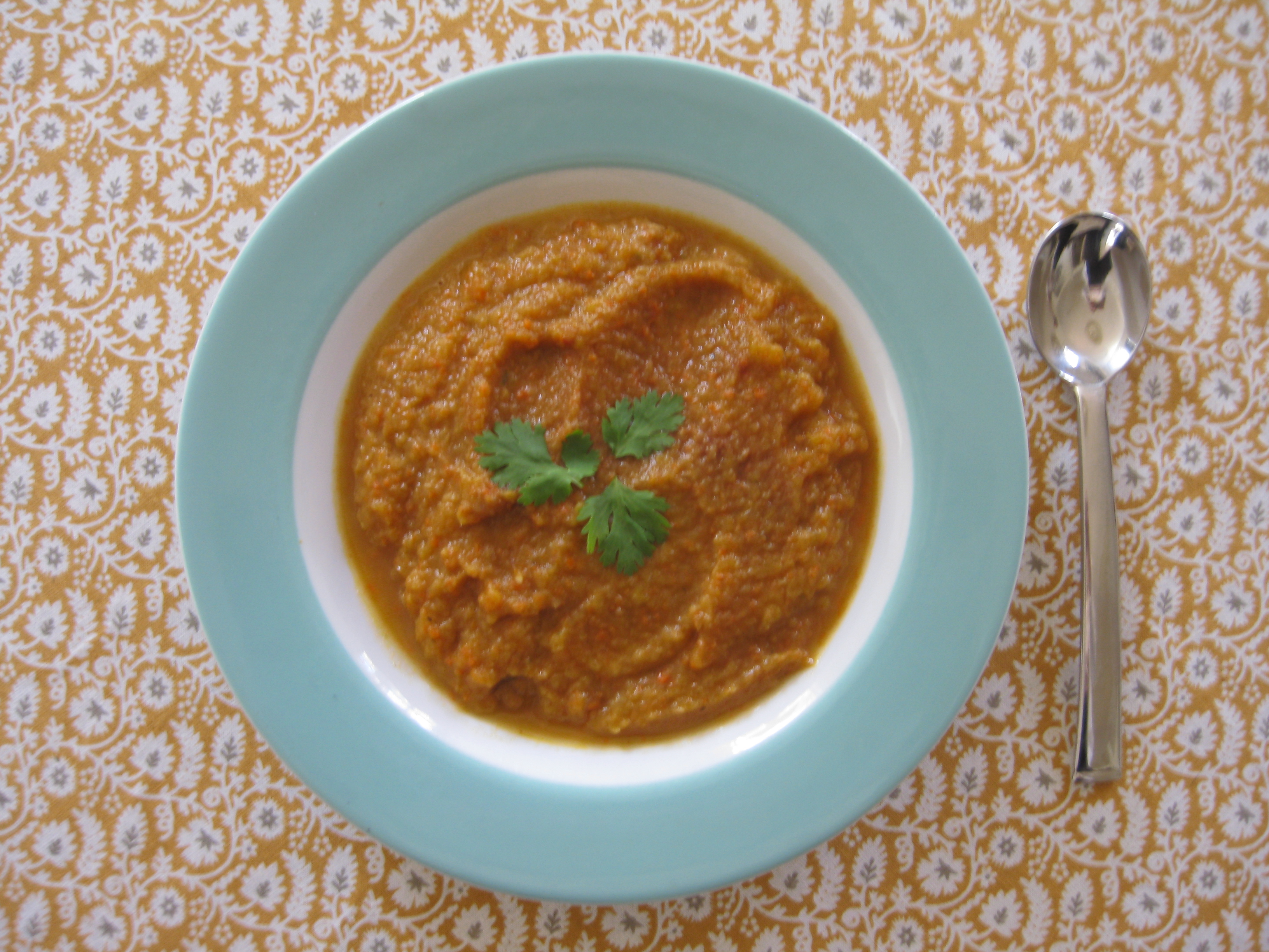 Slowly saute the onion and celery in olive oil (you could use butter if you’re using cream at the end) for about 5-7 minutes or until soft. Add the thyme and bay leaf and the reserved vegetables, and stir to coat. Add water or stock and bring to a simmer. Cook for about 25 minutes, or until everything’s fully cooked. Puree in a food processor. Return to pan and season with cinnamon, cumin and cayenne, using the smaller amount and then adding more to taste. Add additional salt if needed, and serve with a little cream or a few snipped herbs if you have some. Makes about 6 servings.