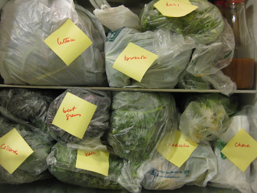 Luckily, this pig-out occurs right before Thanksgiving so I start planning our celebratory feast and the surrounding meals right there in the field. This does put a strain on refrigerator space because greens take A LOT of room. If it takes significant self-constraint not to overdo it in the fields (everything’s so beautiful and fresh!), it takes real ingenuity to deal with the haul when I get home. Our new refrigerator is counter-depth so it doesn’t have the cavernous compartment of the old box, and it’s a German machine that demands order (I defied that). However, with the temperature in the low 40s, some things will stay in good shape in buckets on the porch.