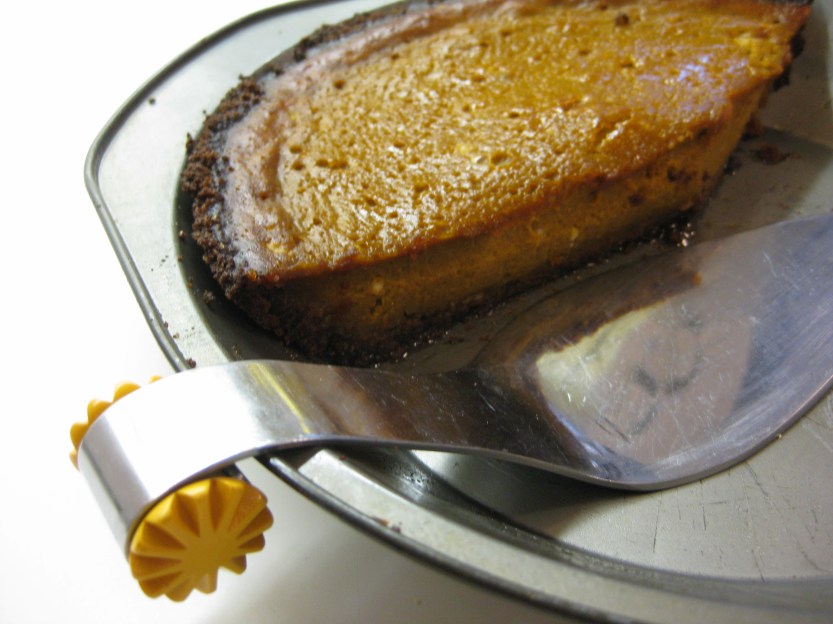 Figuring out how to make a pumpkin pie dairy-free is not hard, given the possibility of using soymilk or unsweetened coconut milk as a substitute for cream or half-and-half. Figuring out a compatible crust is harder. The piecrust that I made last Thanksgiving emulated a whole-wheat crust but was crumbly to the point where I felt it belonged on the beach. It tasted like that too. I was about to repeat the mistake this year when, in the midst of baking the apple pie that was to precede Mr. Pumpkin in the oven, E reminded me that I had had aspirations to make a gluten-free gingersnap crust. So she ran out to the only open grocery store and picked up a bag of gluten-free cookies. We tossed together the new crust and pre-baked it, not losing much oven time on a busy day. It wasn’t the prettiest of pies, but it was good, and a good start for future experiments. Next time, I will think ahead and make my own gingersnaps.