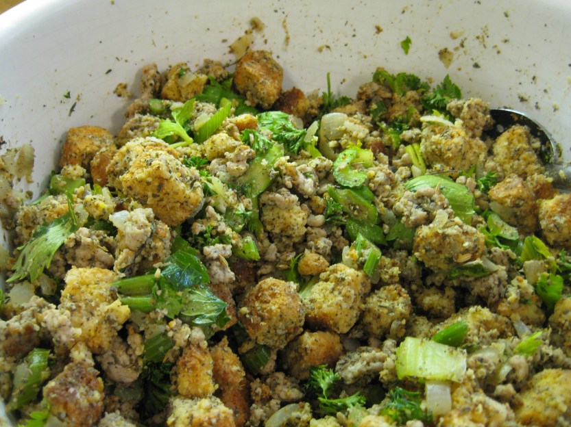 The first year that we decided to be gluten-free and dairy-free for Thanksgiving, I gave up my longstanding tradition of making bread stuffing for the turkey and moved over to a more Southern approach based on cornbread. I had been researching gluten-free baking, so I knew cornbread would be a good option. I used the typical ingredients of celery, onion, thyme, sage, salt and liberal amounts of black pepper, and also added browned sausage. It was bound together by turkey stock that I had made a few days earlier from necks and backs. Some of the stuffing was cooked inside the bird and the rest in its own pan in the oven. One of the tricks I discovered this year was to mix the stuffing a couple of hours in advance and let it sit, which allows the flavors to get acquainted. (Refrigerate it if the time’s lengthy.)