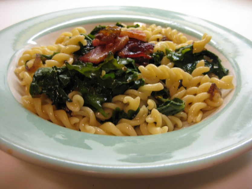 So, I made a pasta dish that, based on The Dad’s comments, is rather like the classic chard, raisin and toasted pine nut combination. I shallow-cooked kale in water, and twisty pasta in turkey broth from Tday (normally would use chicken), and combined them with red onion slowly cooked in olive oil and finished with balsamic vinegar. Then I added some grated Parmesan cheese to smooth things out and a sprinkling of parsley to pique the flavor and the color, plus ½ slice of thick-cut lean bacon as garnish. Yum.