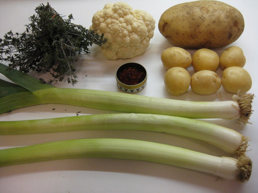 Chicken stock with thyme and saffron, from the previous recipe