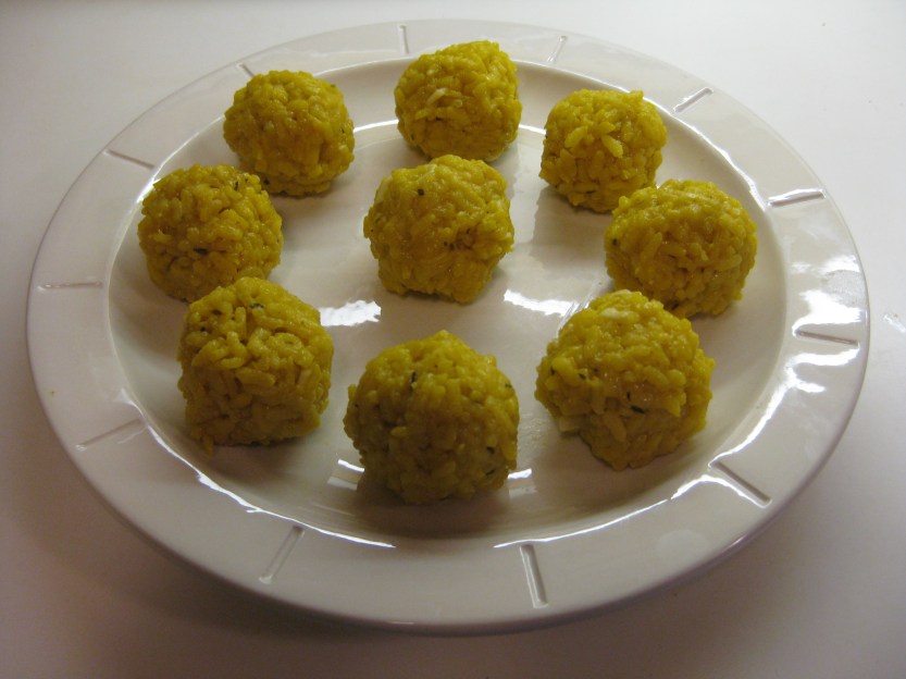 These are similar to what Italians call arancini, “oranges” made with rice. I never made them before, so I improvised from a couple of sources and followed no one’s in particular. This dish is like breaded and fried risotto with a surprise (ham and cheese) in the middle. You could make them as mini-cakes without the filling. These were good, filling, but a little different from the other items. So I could have left them for another day, or simply made risotto from the rice and flavorful broth.
