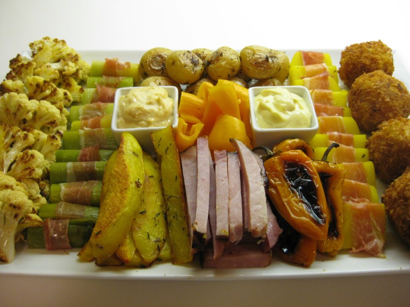 I liked the blend of colors, all within a single range, and didn’t feel the need to add more green or any red ingredients to the platter. However, I did think that, with the aioli, I needed something raw, so I added cut-up mini peppers. I also used some oven roasted mini peppers, along with slices of Black Forest ham. I made enough for 6-8 people grazing and while everything fit on one 10×15-inch platter, it was too crowded. I ended dividing the food among several smaller dishes, but I could have served it antipasto-style on a large round platter. It all depends on where you’re serving this.