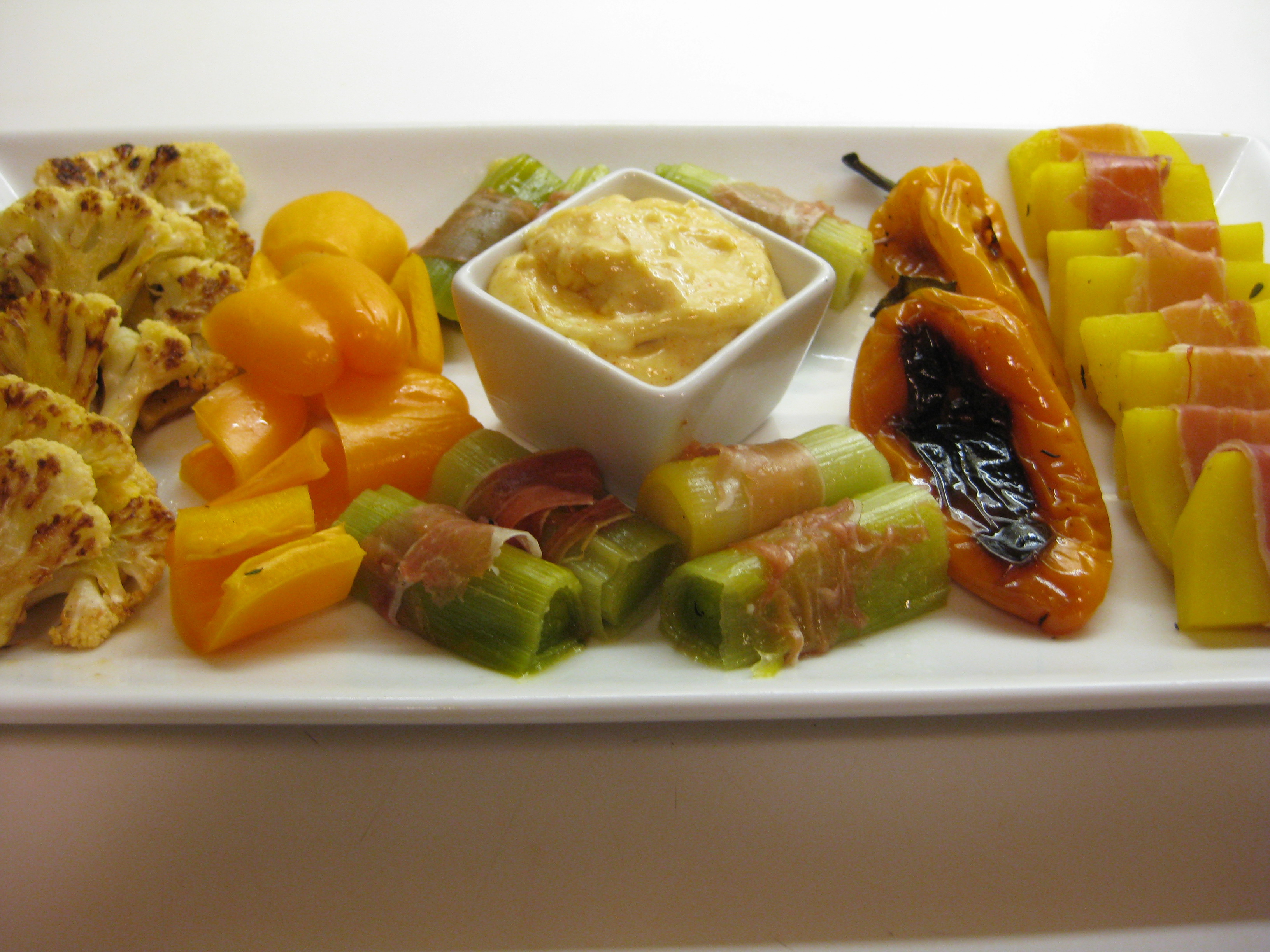What I prepared: saffron- and thyme-infused leeks and potato slices wrapped in Serrano ham, cauliflower and potatoes roasted in saffron oil, plus simple slices of ham and raw and roasted pepper, all of which are served with a spicy mustard aioli and aioli spiked with the smoked Spanish paprika called pimenton. I also made ham- and cheese-stuffed rice balls, using the balance of the flavorful vegetable cooking liquid. Plate it beautifully, pour the wine, and you have a mini feast of appetizers, vaguely like a Spanish tapas. So who needs a big holiday meal after that?
