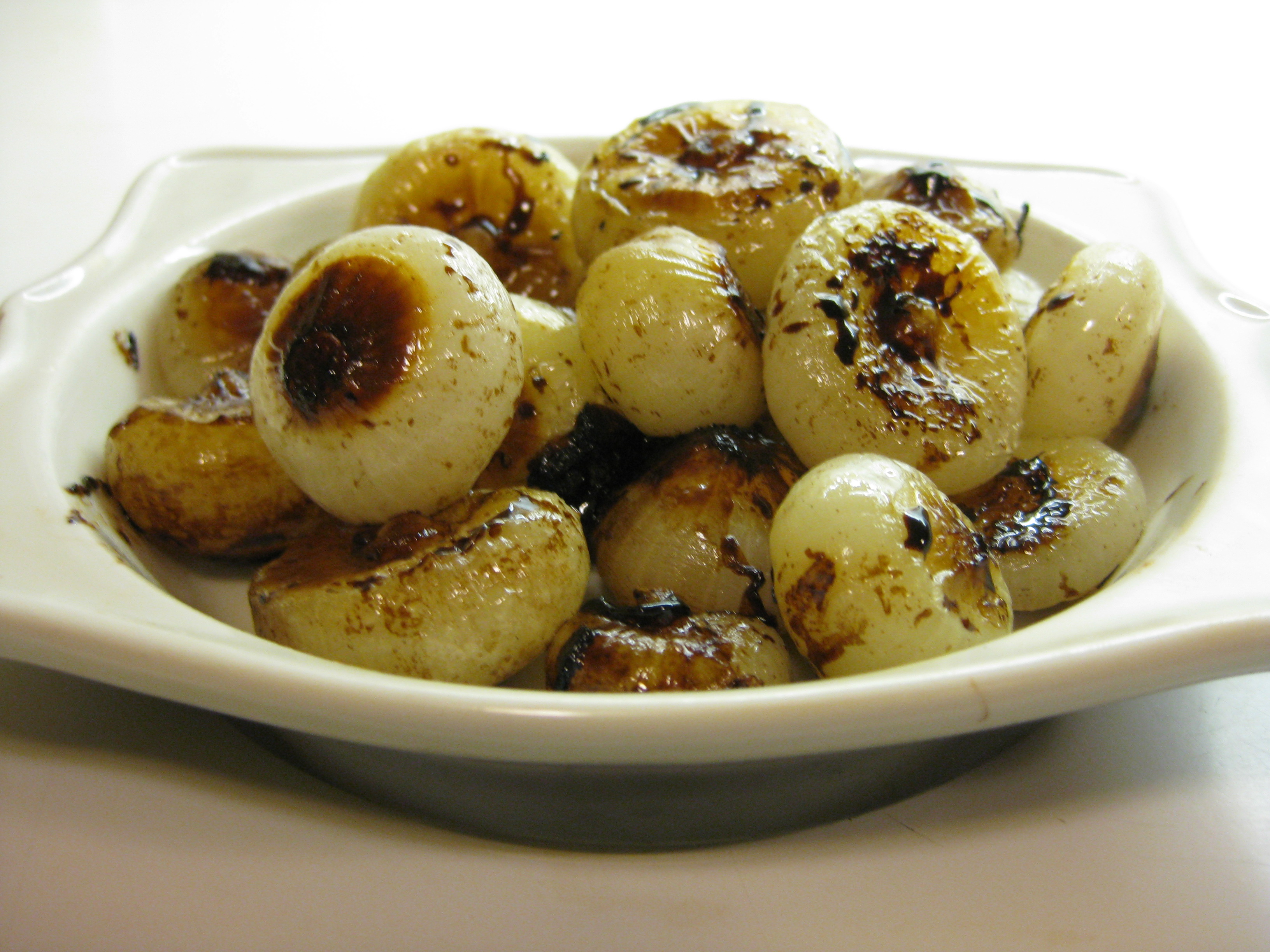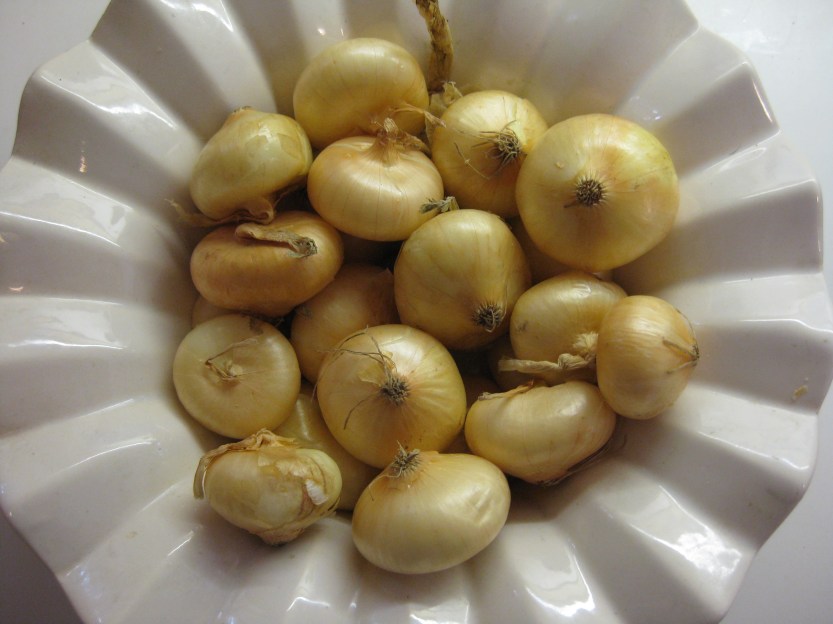 Cipollini onions are small, flat onions with a light golden color and a papery skin that’s hard to peel. I picked out a small bagful of equal size cuties to roast and serve at Thanksgiving, but they’d be good anytime. The trick is in the peeling. As with tomatoes and peaches, a quick dip in boiling water allowed us to slip the slimy skins right off. They were then coated lightly in olive oil, sprinkled with a little coarse salt and roasted in the oven at 375 degrees for about 15-20 minutes, until just starting to get tender. I added a few splashes of balsamic vinegar to the pan and finished cooking until tender but not falling apart. (Test with a turkey trusser or cake tester since a fork is too large and could break them apart.)