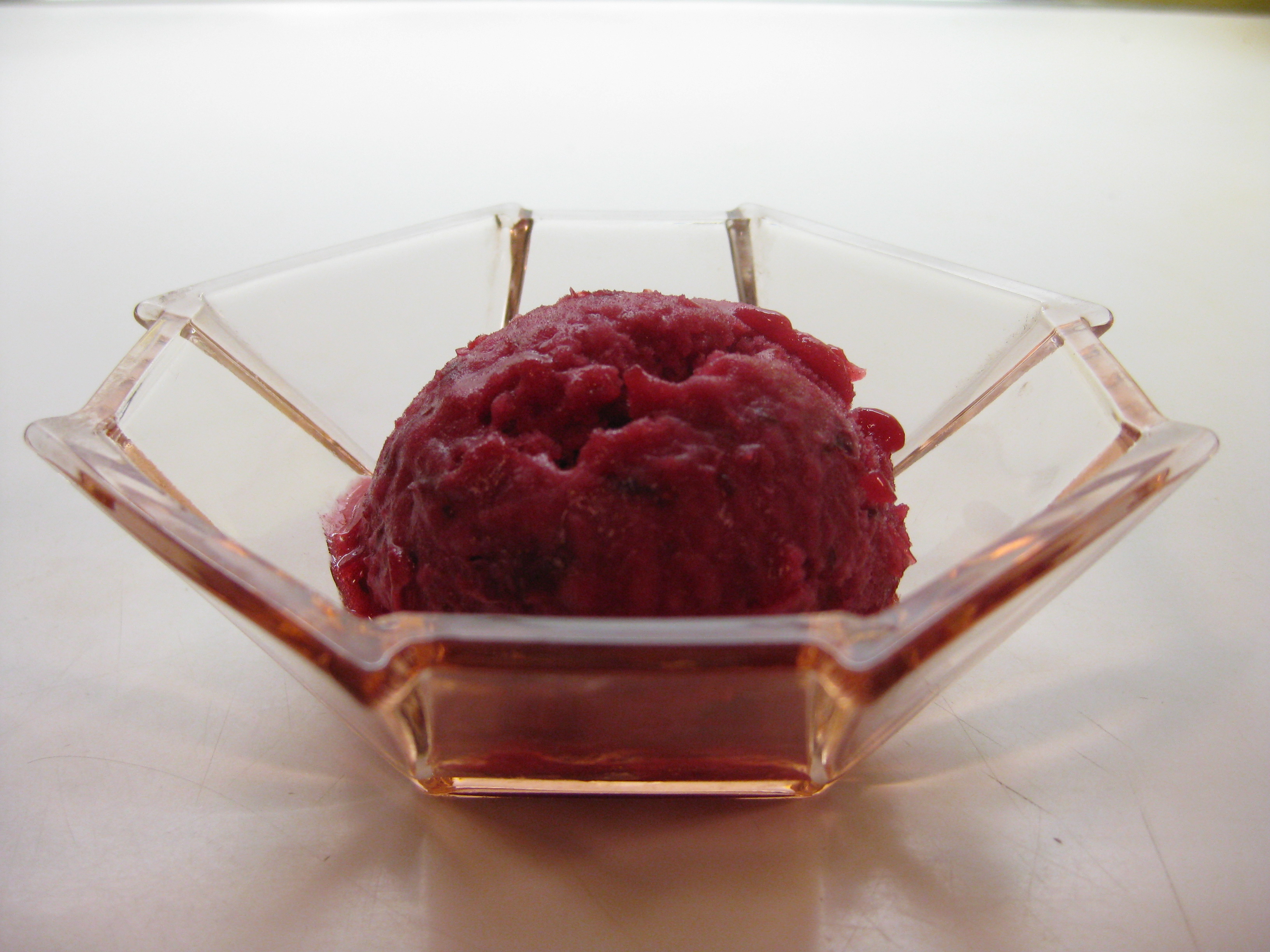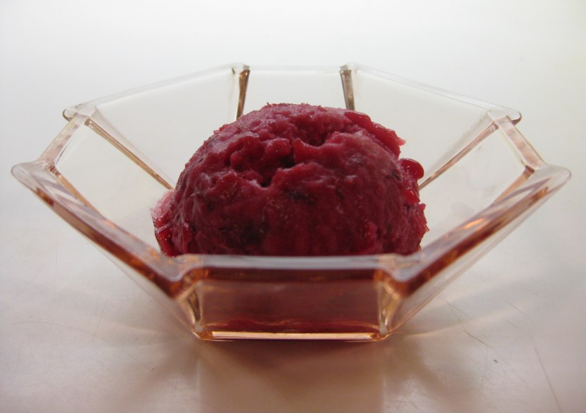Having to retreat from a certain mulled apple cider sorbet the other day, I decided to go for broke with the cranberries. They have a lot of pectin, I think, based on their gelling capacity when I make Thanksgiving relish, so that already bodes well for consistency. I also didn’t feel that I needed to process a whole quart of the sorbet mixture. To get to a quart, I would have added liquid and that would aggravate the ice factor. This turned out perfectly. Because of the concentration of berries, you can eat only a tiny amount at a time. We could have used this as an intermezzo at our abundant Thanksgiving feast, if anyone does that anymore. It cleanses the palate at any time.