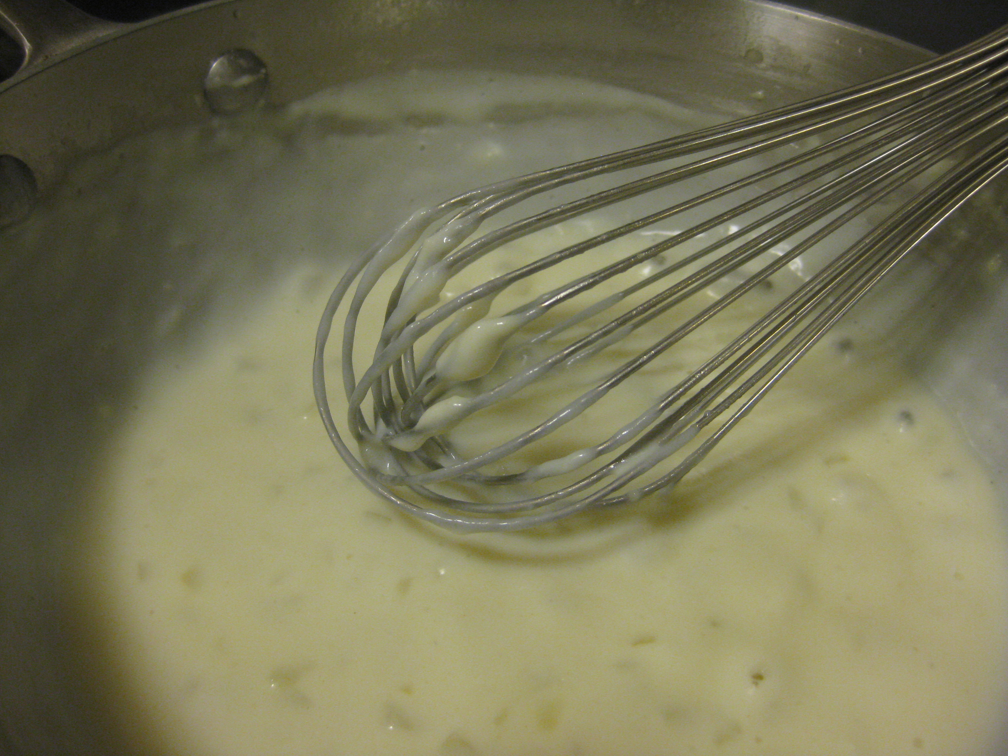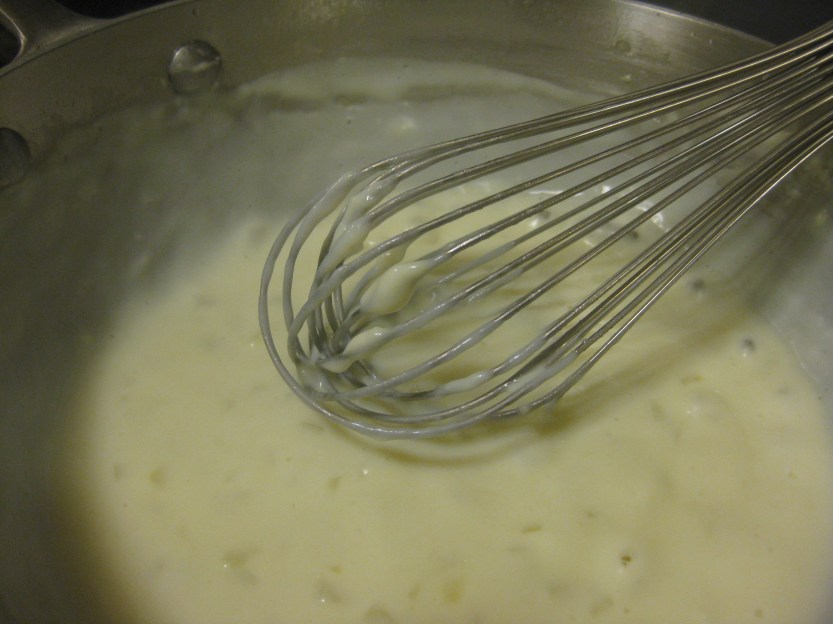 Cook the onion in butter over low heat until translucent, add the flour and stir to combine, cooking without browning for a minute or two. Slowly add the warm milk, whisking to keep the mixture smooth. Cook until thickened, stirring regularly to keep the bottom from sticking. Season with a little salt, adjusting the amount depending on what else is being added. To make Mornay sauce, stir in the grated cheese until melted.
