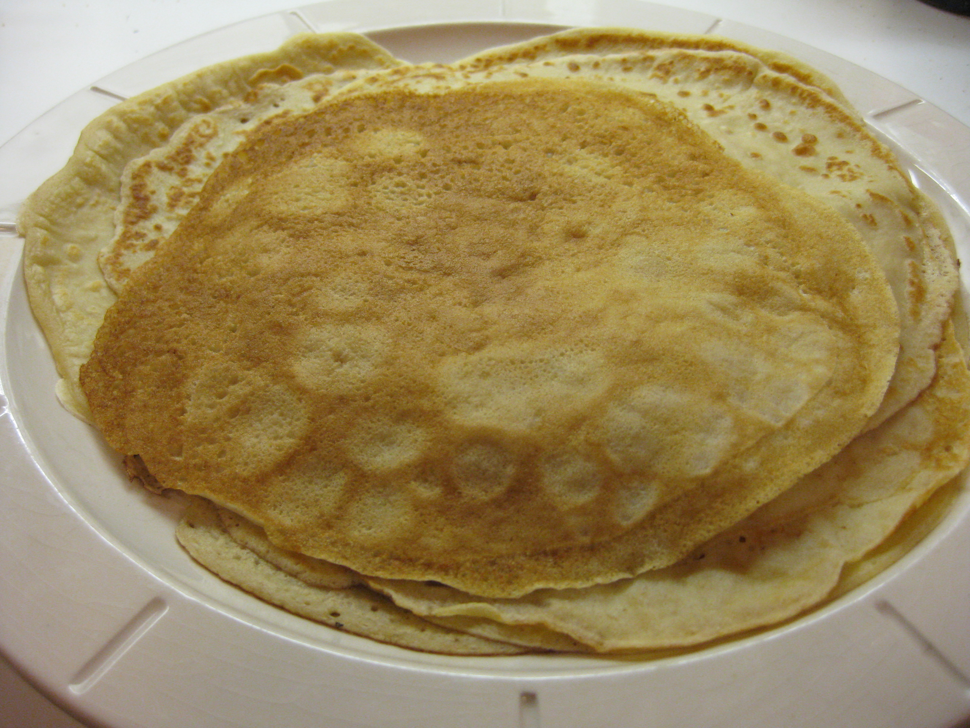 One of the earliest requests was a recipe for crepes. So I sent one off in an email and by the time I got around to posting this, OK already had positive results with the basics. In fact O said that having crepe batter in the refrigerator at all times has become “essential to the quality of life.” Hmm. I know that he’ll think that’s especially true after returning home from a long day/night in the studio since OK no longer have a freezer or pantry to turn to. Think daily bread, but also know that crepes can be pre-cooked and stored, nicely stacked.