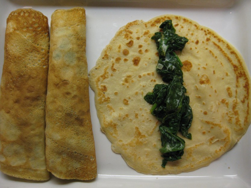 Today, I made crepes filled with spinach bound in a little onion Béchamel seasoned with grated nutmeg (could have been chopped dill in another season). I cooked ours in the oven, adding grated cheese to the Béchamel to make a “Mornay” sauce and spooning it on top. For the oven-less OK, a sprinkling of grated cheese and a very quick pass in the microwave would do it. (FYI beware that a version of Béchamel called “velouté“ is made with meat broth.)