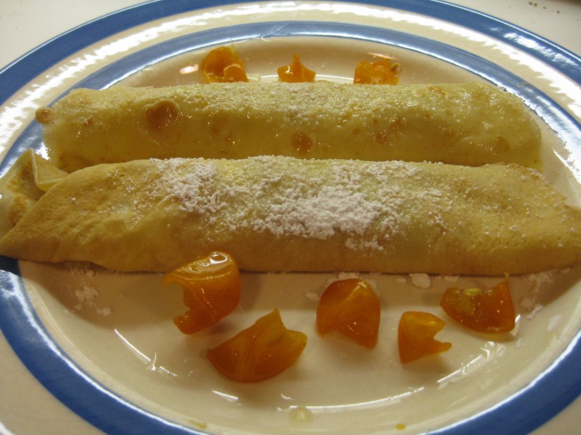 We had leftover crepes, so I made a dessert version with filling that combined ricotta cheese, grated orange rind, and homemade kumquat syrup that I had in the refrigerator, garnished with poached kumquats. Alright, I know that most people don’t just happen to have poached kumquats on hand, but I’ve been messing around all month with canning citrus, struggling with those puckish little buggers, which I suppose are better off eaten than composted. Or not. A good alternative for the filling would be a fruit jam in winter or fresh fruit in season, with or without the ricotta. Or chocolate, always.