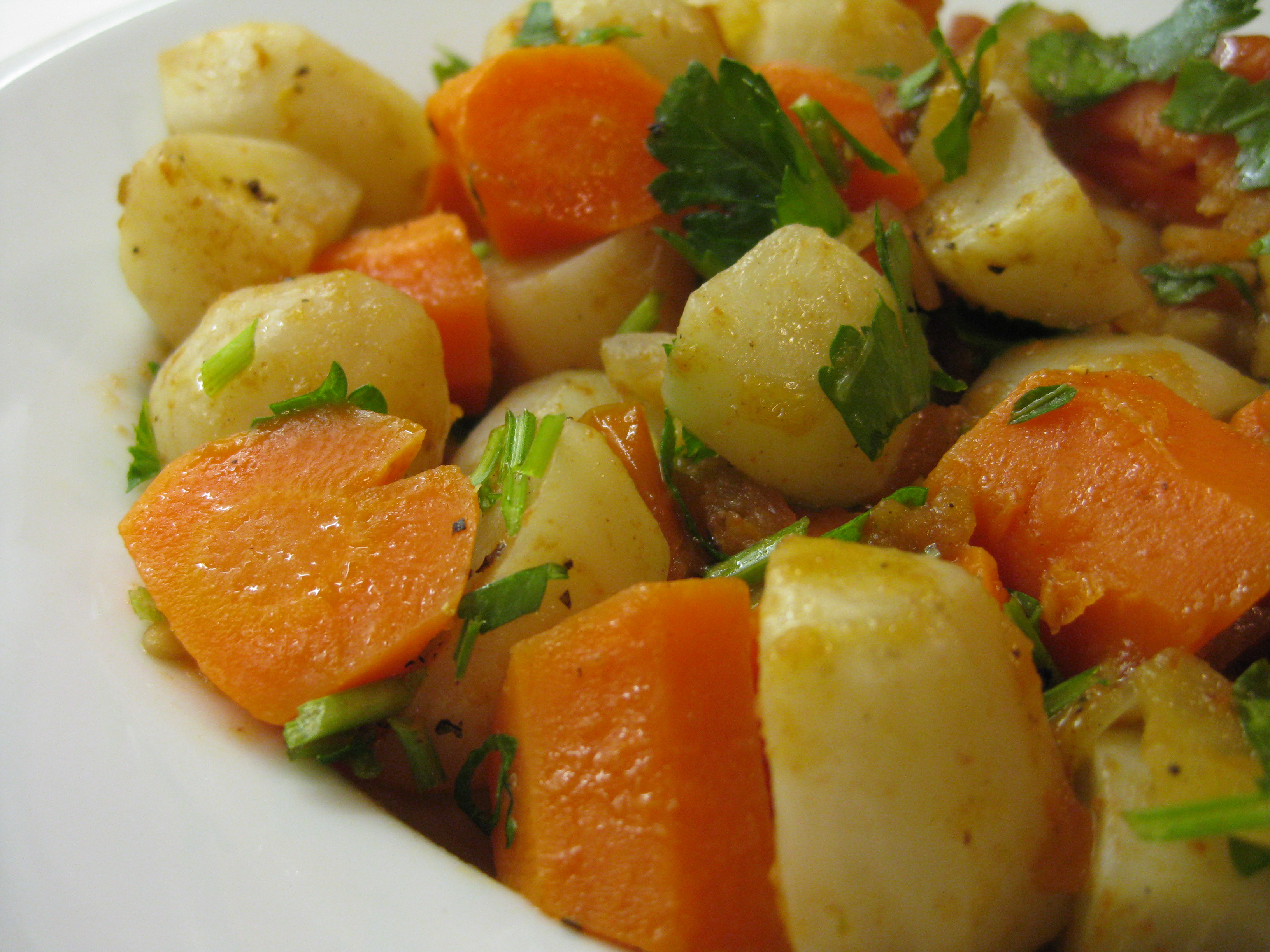 Cook the onions in the butter until translucent, add the turnips and sugar and continue to cook until the sugar somewhat carmelizes the surface of the turnips. Add the garam masala or allspice and stir to coat. Add the tomatoes, cover the pot and cook, stirring occasionally, until tender, about 10-15 minutes. Season to taste and garnish if you would like (I added braised carrots and chopped parsley).
