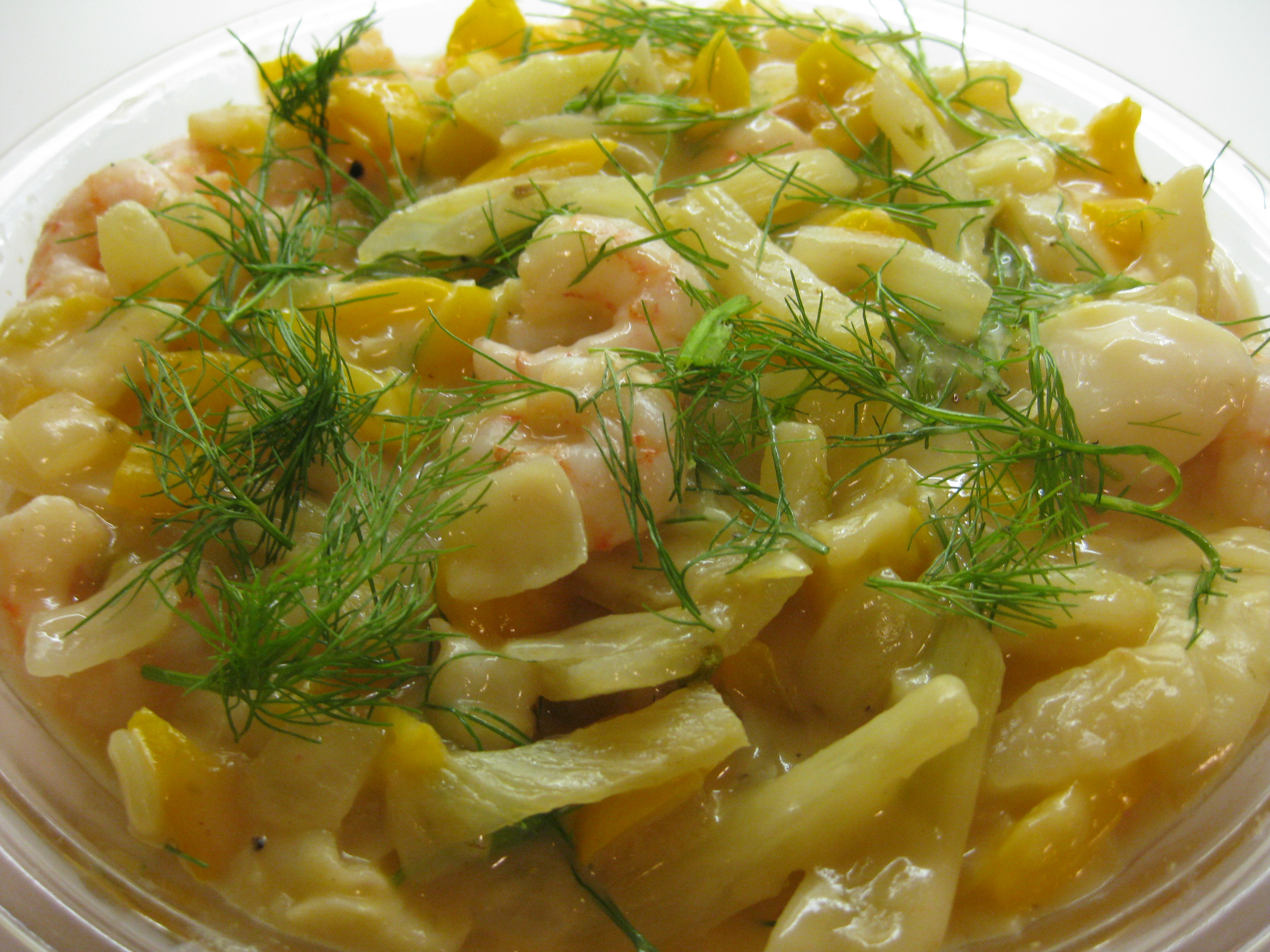 Prawns, fennel, sweet pepper and passion. Hmm. Lots of possibilities for this Paper Chef challenge. Luckily I shopped for the seafood before a giant winter storm shut us in. One of my passions is to seek and use the freshest, most local, and hopefully organic ingredients. With nothing called a prawn in our markets, I was lucky to find first-of-the-season tiny Maine pink shrimp that were never frozen. While Maine’s not exactly around the corner, it’s a lot closer than Vietnam, which is where some of the other shrimp were harvested. I was also lucky to find fresh scallops from Barnegat Light on the Jersey shore, some 40 miles away.  I already had a sweet bell pepper and a large bulb of fennel, both organic but not too local I’m sure. So I was set to cook when the snow hit.