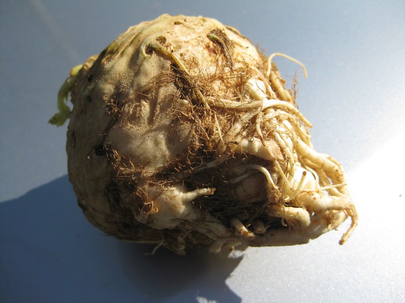 Celery root, also known as celeriac and knob celery, is a lumpy sphere with gnarly tendrils. While reminiscent of the grotesques in a Hieronymous Bosch painting, it cleans up into a delicious vegetable that can be eaten raw or cooked. (The way I photographed this one, quite by accident, makes it particularly anthropomorphic if you squint your eyes. A mutant from a sci-fi flick?) This was the last of several celery roots that I received from or CSA farm and it kept remarkably well.