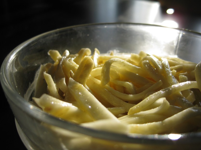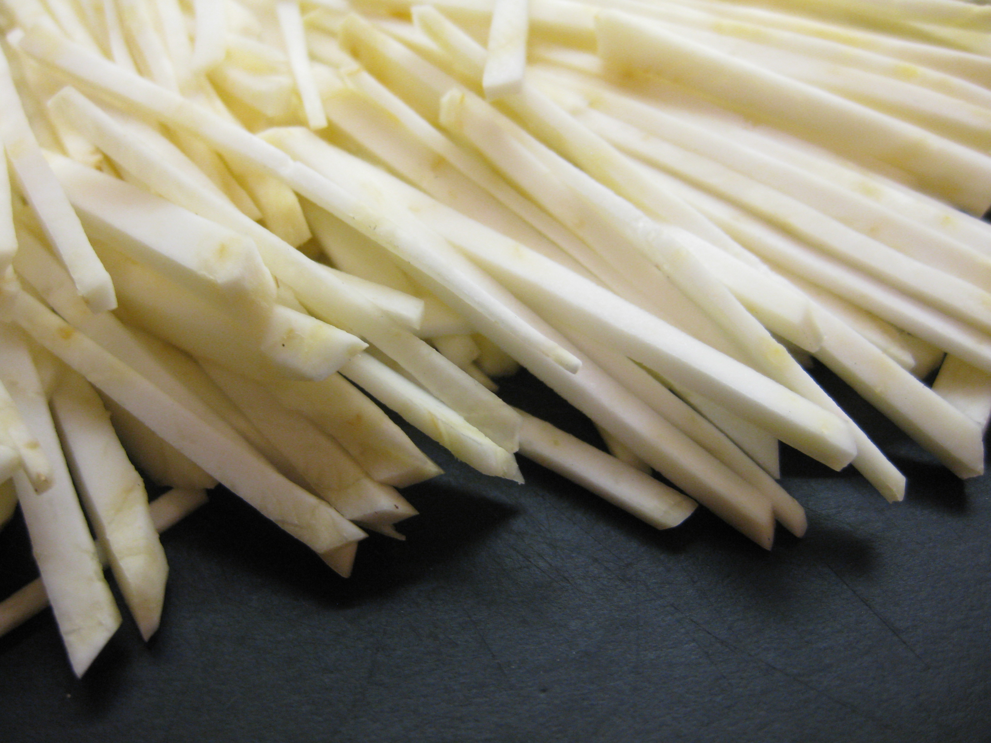 At this time of year, when the snow is still piled high, fresh salads help cleanse the palate and get us ready for spring. I’ve been experimenting with salads made from root vegetables, which are prevalent throughout Europe. One of my favorites is the French classic “céleri-rave rémoulade,” celery root in a mustard sauce. Julienned into matchsticks, the root, which is non-starchy and somewhat tough, is softened in lemon juice and salt, then tossed with an emulsified dressing of mustard, olive oil and white wine vinegar.