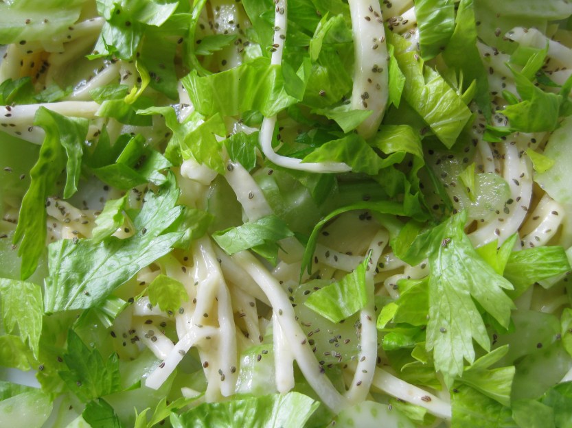 Combine celery root rémoulade with thinly sliced celery from the stalks. Add slivered leaves (use the inner leaves from a stalk of Pascal celery) and toss. Sprinkle with celery seed and serve the salad fairly soon after assembling it. The proportions of the ingredients can vary significantly, to taste.