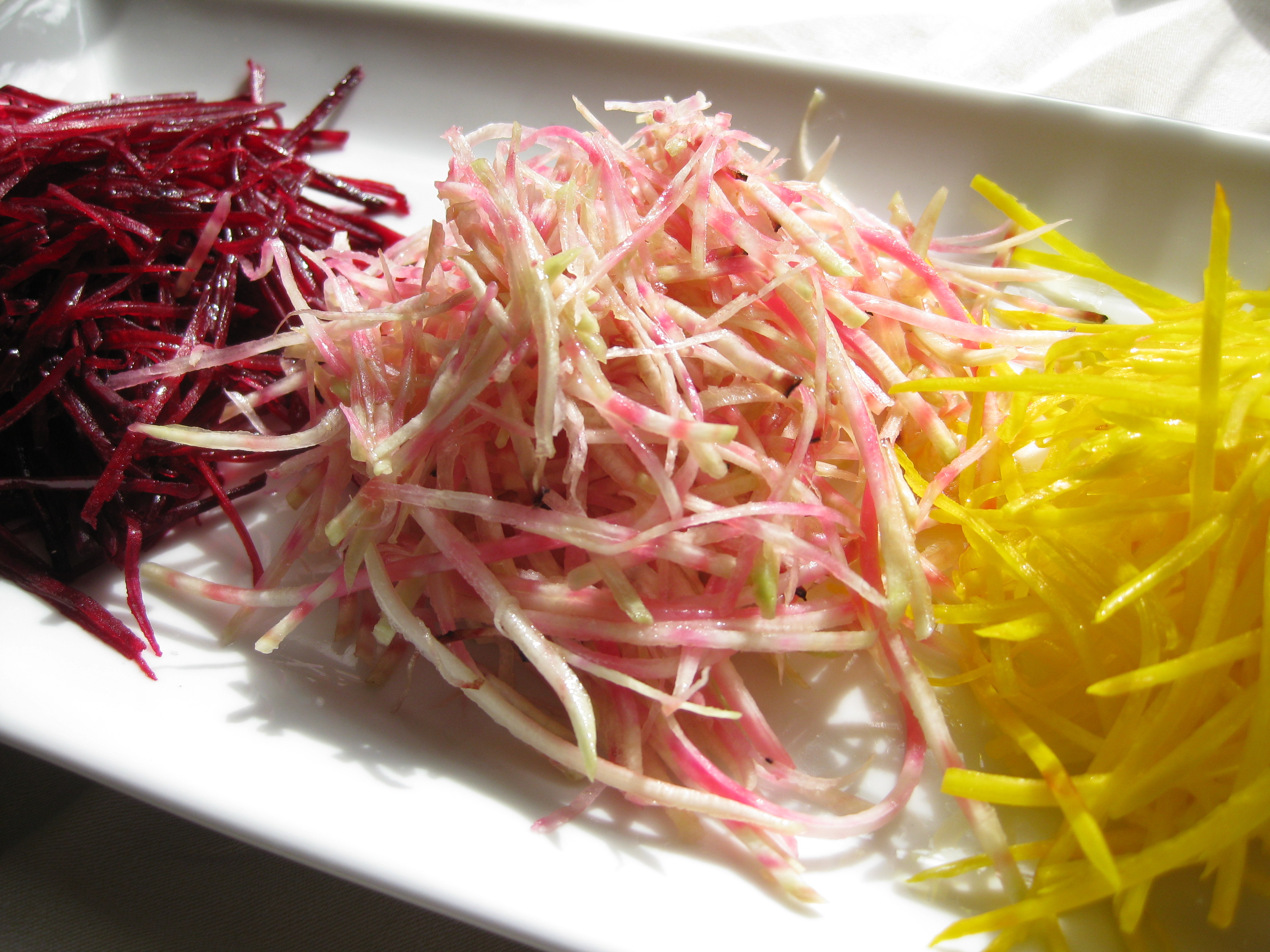 I recall that, when I briefly lived in Vienna as a student, the schnitzel was typically accompanied by a raw beet salad – grated or shredded. I’m fond of roasted beets during the winter. However, looking forward to a warmer season, raw food appeals, as it feels more refreshing. Although I promised in February to work through the multitude of over-wintered roots, I still have some hangers-on in early spring. Luckily, I had three beautiful beets large enough for shredding. There were a typical red beet, a bright yellow beet and a pink and white ringed Chioggia beet, which came out striped when shredded. Pretty!