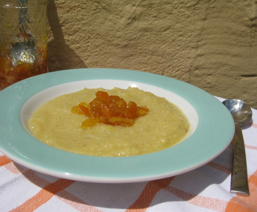 I made a completely fortuitous discovery on my kitchen counter last weekend. I had made a light soup of celery root, leeks, and a little potato for texture and was about to serve it for lunch. It seemed a little flat but I was reluctant to add salt or cream. I think oranges go well with celery root, so I thought of grating some orange rind on top and spooning in a little orange juice. While that was good, the combination still wasn’t spunky enough. My husband has been working his way through a jar of chunky orange marmalade that was sitting there on the counter next to the soup bowl. So in went a big spoonful. Yes! That’s it. The perfect combination… earthy, tart, refreshing, delicious.