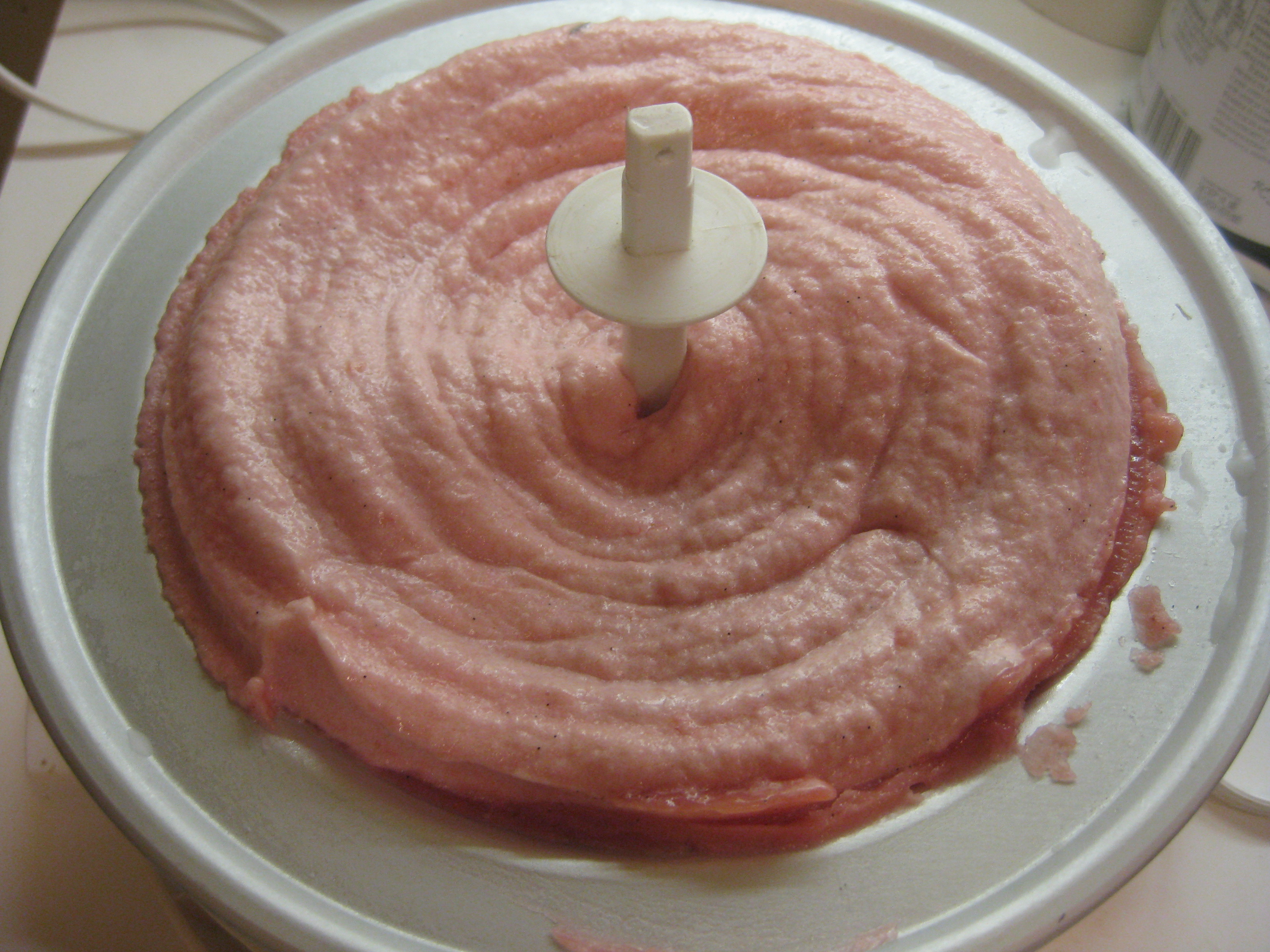 Rhubarb produces a rather creamy mixture for sorbet, as do various berries. Keeping sorbet from becoming icy is sometimes a challenge. Some recipes recommend adding a little alcohol, say a tablespoon or two of Grand Marnier. Others recommend a couple of tablespoons of light corn syrup, which while it sounds disgusting (corn syrup being the culprit in the obesity debate), it actually does seem to make a difference. While making this, I realized that whipping a lot of air into the mix does the trick just as well. Unlike some sorbets that I make, yielding 1 pint, or 1 ½, this time I made a full 3. It stretched the volume on my ice cream maker but the result was a smooth and creamy mixture that stayed that way after being frozen for a couple of days.