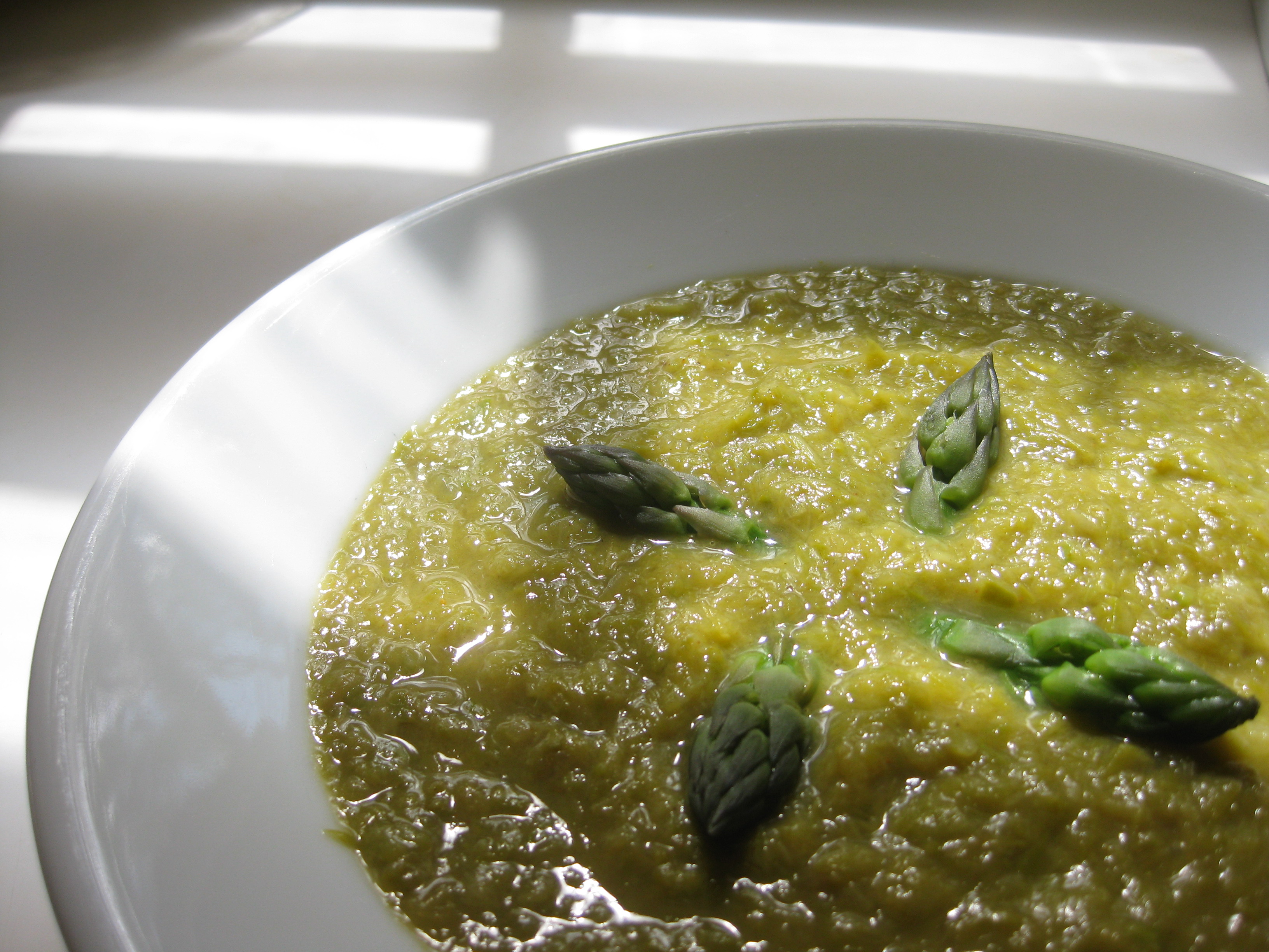 This soup is on my all-time favorites list and I have been making it for years. The warmth and heat of the curry spices create a wonderful counterpoint to the asparagus. Once pureed, it has a creamy consistency without the cream.