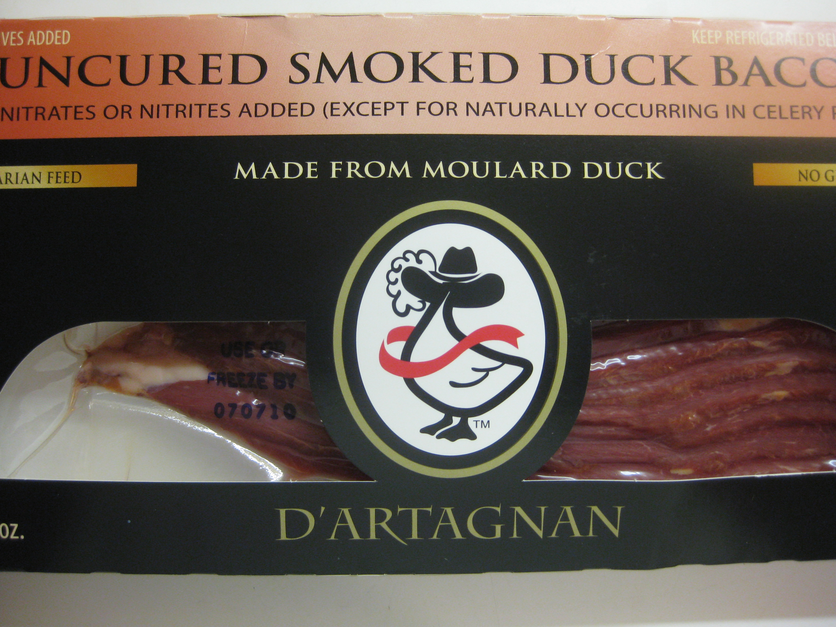 The second discovery was duck bacon. In response to the ingredients in this month’s Paper Chef challenge (wasabi, duck, tomatoes, and cream – yikes), I was cruising the grocery aisle looking for duck… maybe a breast of duck or a leg confit. Actually, neither appealed to me, not only because of the high price but also, my family doesn’t much like duck. Duck in our local store is fortuitously located next to the better varieties of bacon. So there it was: duck bacon. D’Artagnan uncured smoked duck bacon. Lean meat with a little stripe of fat. A healthier alternative to the usual pork bacon. Having no idea what I would do with it for Paper Chef, it still seemed better than the other two duck options.