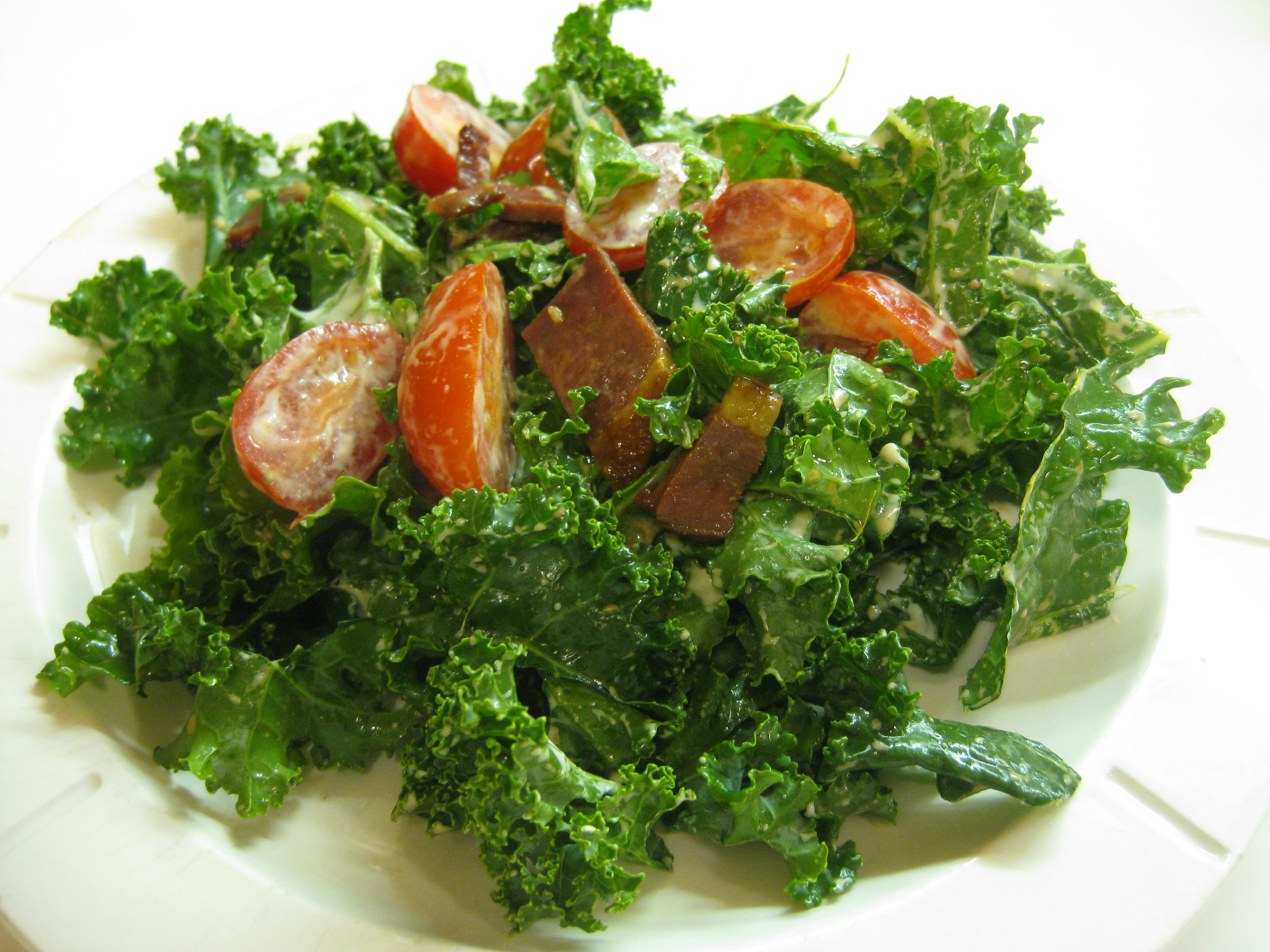 The wilted salad of dandelion greens and halved grape tomatoes tossed with wasabi cream and duck bacon was so delicious that I made it again the next day with the freshest kale from the farmers’ market. It would also be good with curly endive or spinach. Traditionally, wilted green salad includes onion sautéed in the bacon fat. It adds another dimension so I included it in the recipe as an option.