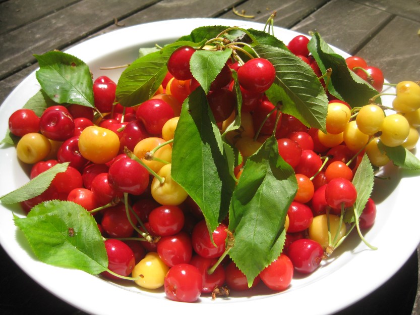 I’m posting this now because this past weekend – Fathers’ Day – is when the cherries are usually ready for picking at our local orchard. This year, everything is about three weeks ahead of schedule, and instead of following the strawberries, cherries were ripe at the same time. The orchard grows over a dozen different kinds of cherries, under “tents” that keep the birds away, and it’s a visual and well as culinary treat to sample some of each.