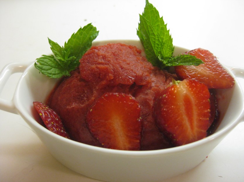 The early season caught me off guard, and I didn’t make the most of the cherry harvest for preserving. But did get to make both cherry and strawberry sorbet. There’s enough body in the fruit to keep the sorbet from becoming too icy, but I added a little kirschwasser to each to forestall the ice and perk the flavor. This is a pretty standard formula for fruit sorbet around here, inspired by the inimitable David Lebowitz’s book The Perfect Scoop.