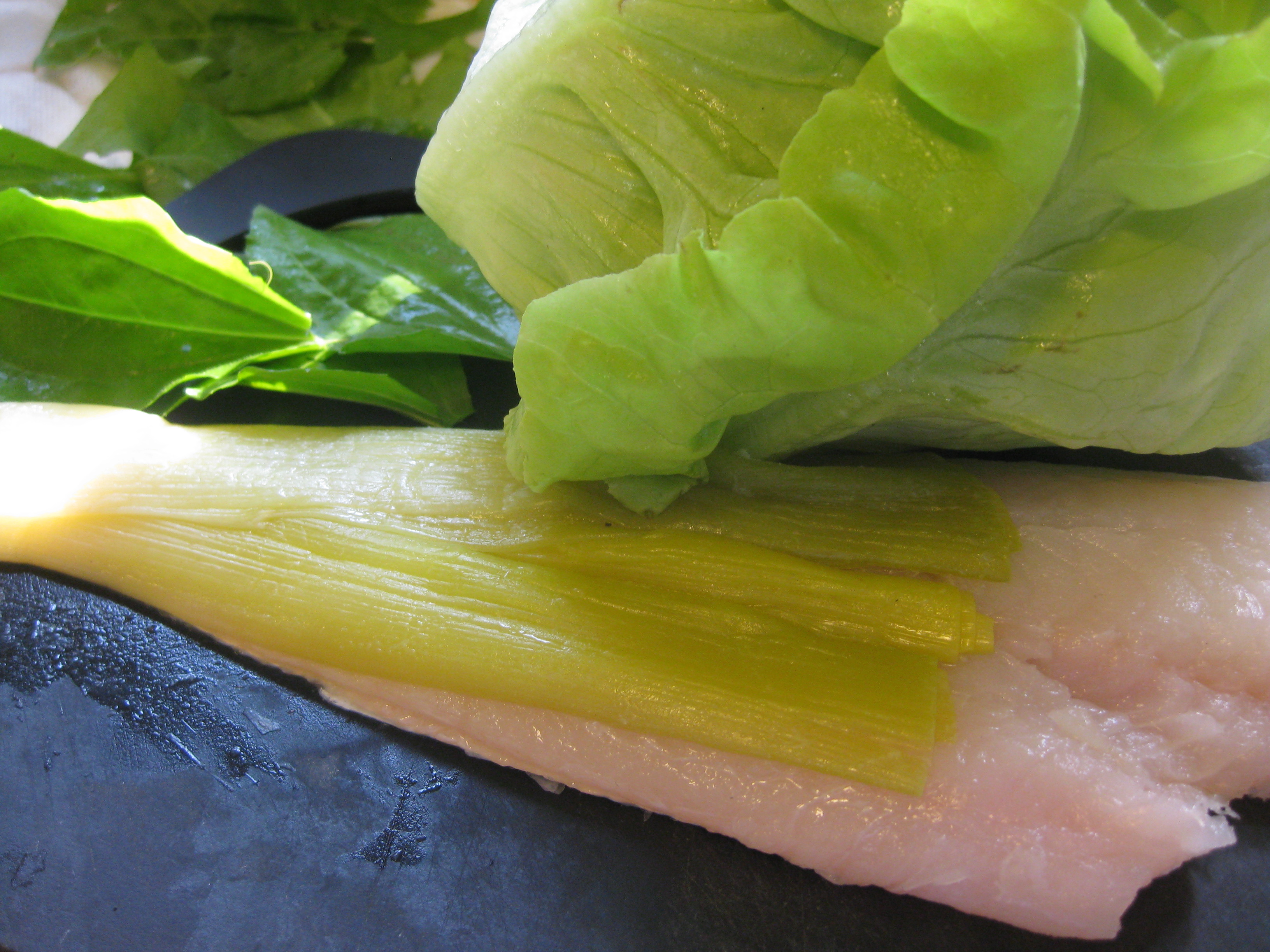 Pre-heat the oven to 450 degrees. Lay the leeks and sorrel on the inside (non-skin side) of the fish, add a little salt and pepper, and turn the filet over on itself to create a bundle. Wrap the lettuce leaves around the fish, making sure all surfaces are covered (It’s alright to double up on the wrapping as needed.)