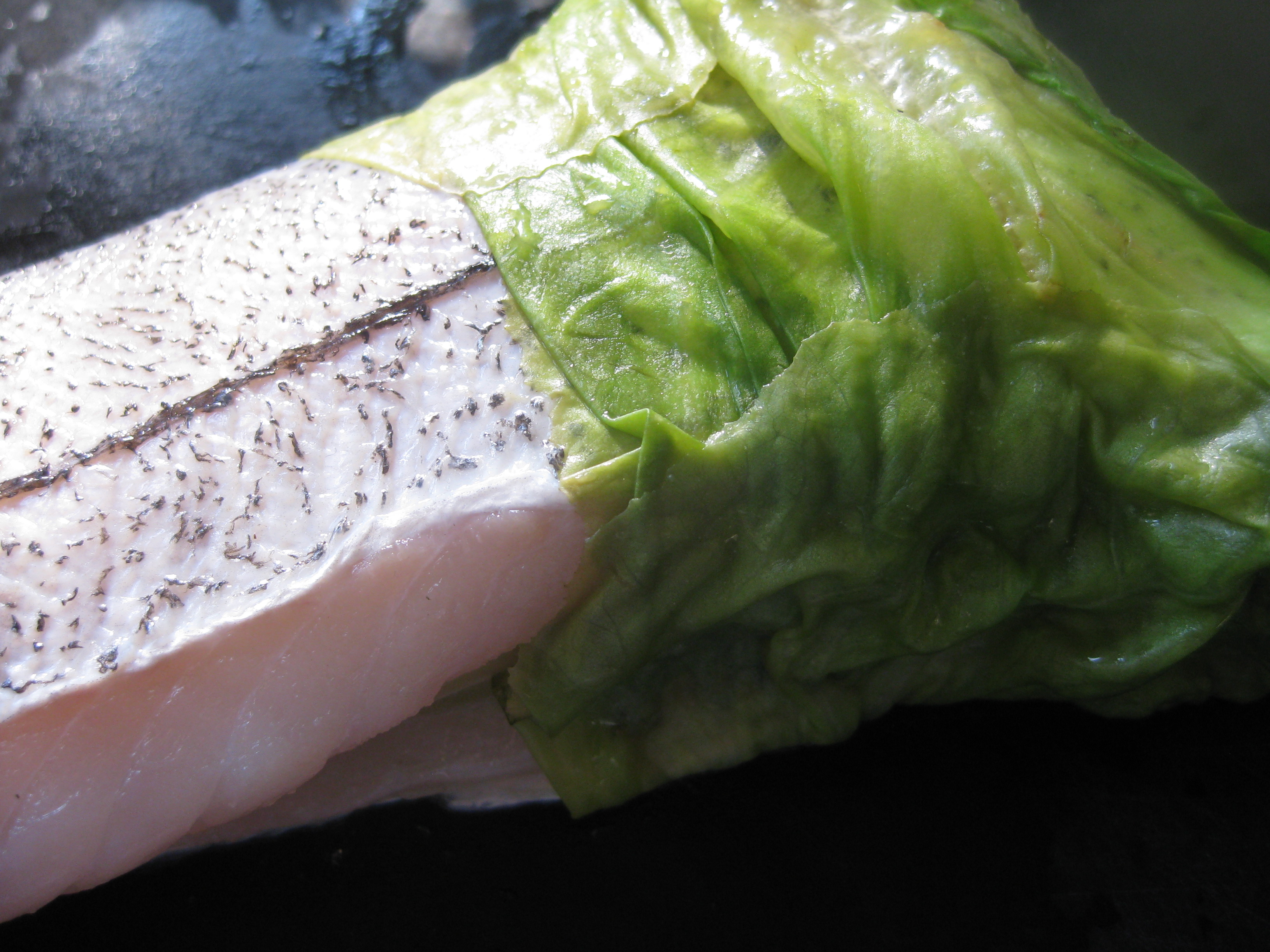 I learned this technique from Fish, a volume in the series of topical publications called the Time-Life Good Cook/Techniques and Recipes, edited by Richard Olney and published in the late 1970s and, early 1980s. I own a few volumes and scout out others in second hand bookstores. The first section of each book reviews a variety of techniques on the topic, in this case fish. The techniques are followed by a collection of recipes from sources worldwide, some well known and others seemingly obscure but always interesting. The recipes and techniques are not necessarily cross-referenced. I learned the lettuce wrap from the techniques section.