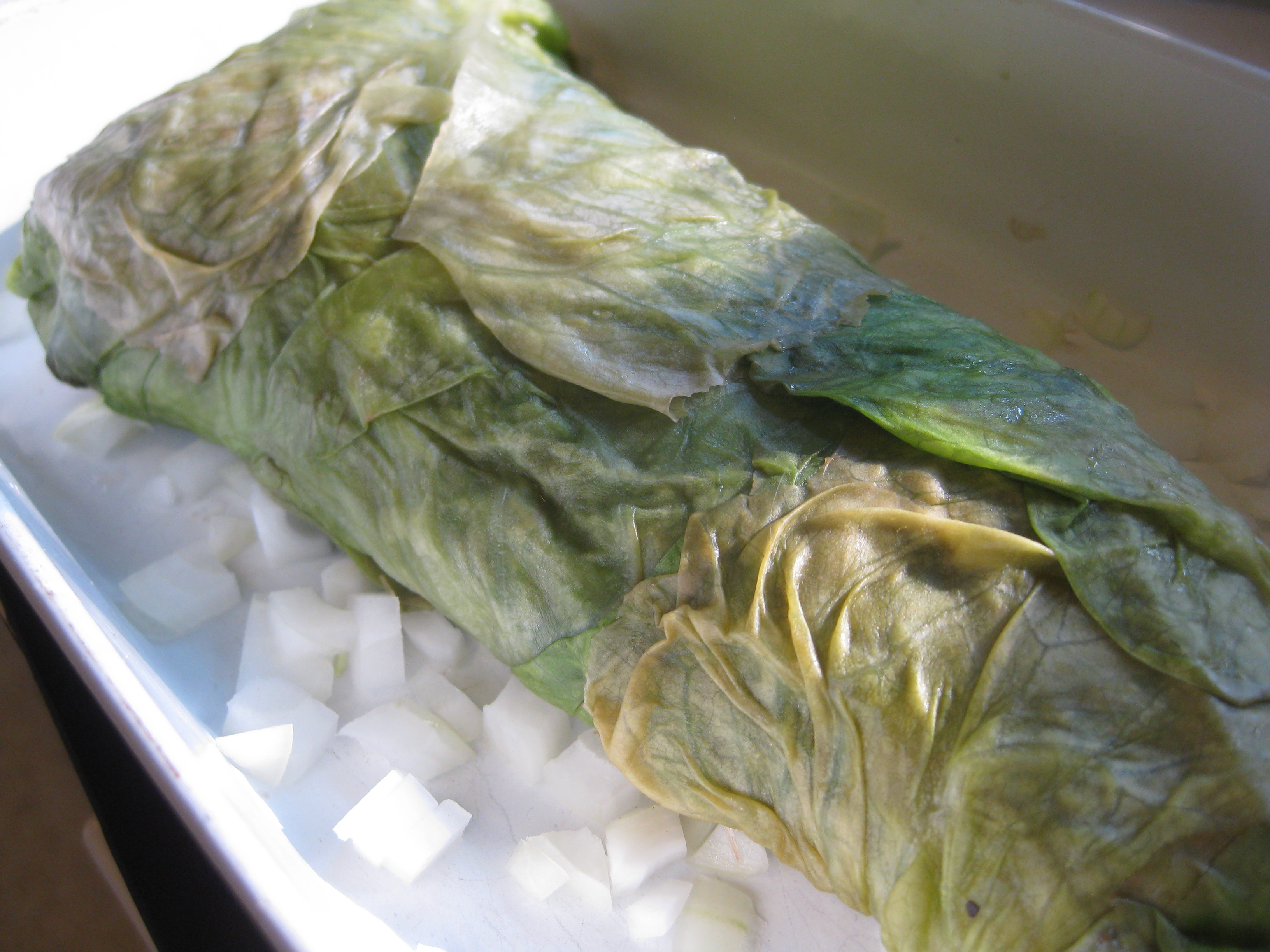 Lettuce, typically eaten raw as salad, is delicious as a cooked vegetable. Cooking fresh peas in Boston lettuce is a familiar use, but I also like to wrap fish in lettuce and bake it. This particular preparation made good use of the abundance of Boston lettuce from the CSA farm, the last snippets of sorrel from my garden and a bunch of leeks. The fish was a line caught halibut filet that I flipped over on itself so that I could stuff it with sorrel and leek. A more typical presentation would be a gutted, deboned and butterflied whole fish. I have also made single-serving bundles.