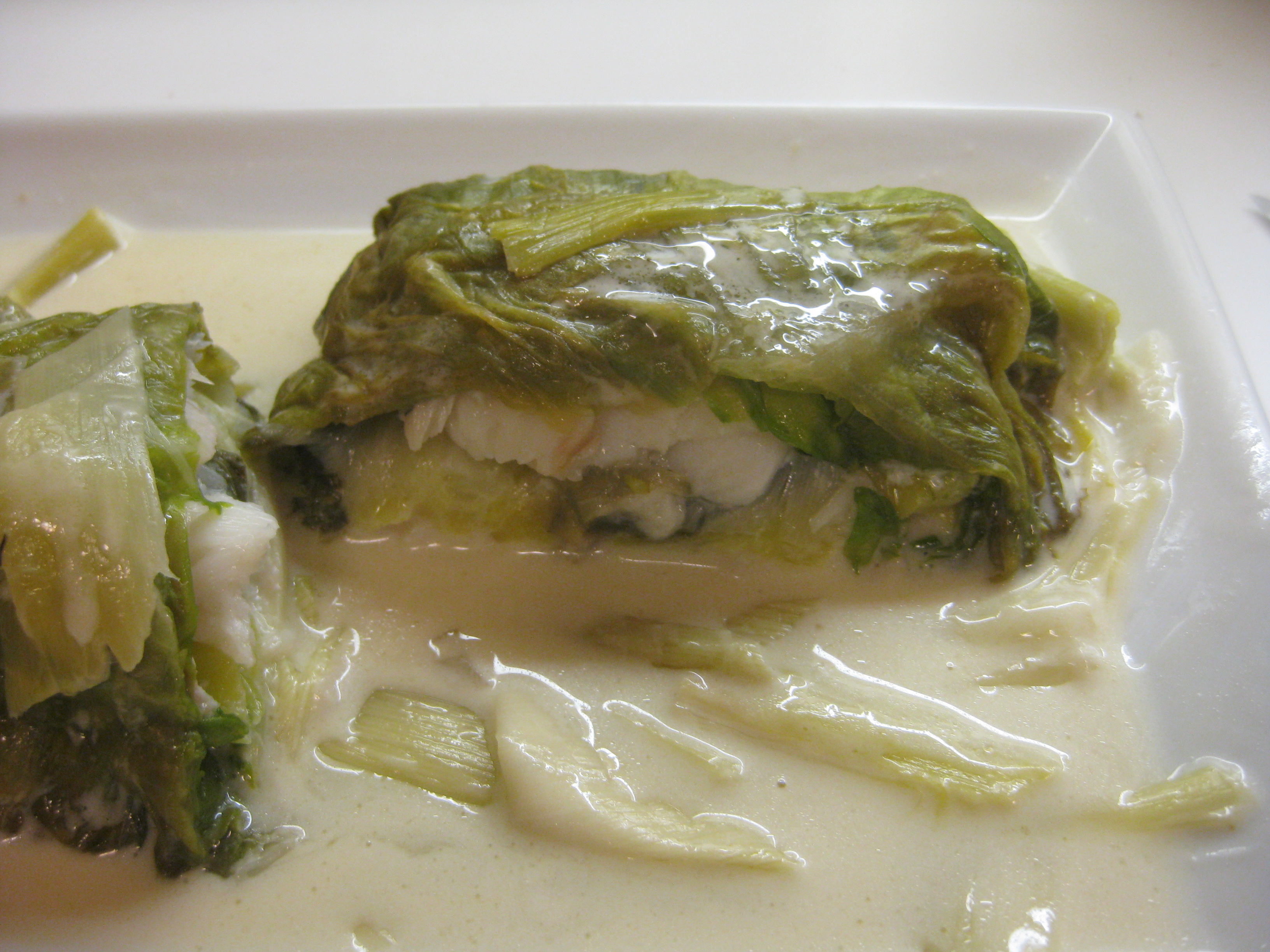 Baked Fish Wrapped in Lettuce with Leek-Sorrel Filling, adapted from Richard Olney, Fish, from the Good Cook series by Time-Life