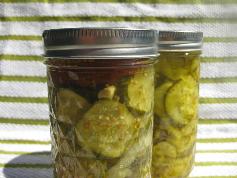 Slice the cucumbers into thicker rounds (1/4 inch or more) than for bread and butter pickles. You can also cut the onions into chunks. Eliminate the celery seed and substitute a head of garlic separated into cloves and coarsely chopped (1/3 – ½ c), adding it to the sugar-vinegar mixture with the onions and cucumbers. Place in each jar as you’re ladling in the cucumbers 1 peeled garlic clove and 2 dried cayenne peppers or bird chiles. Note that the larger peppers are typically less hot than the little ones.