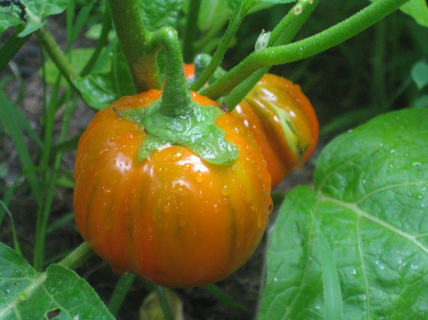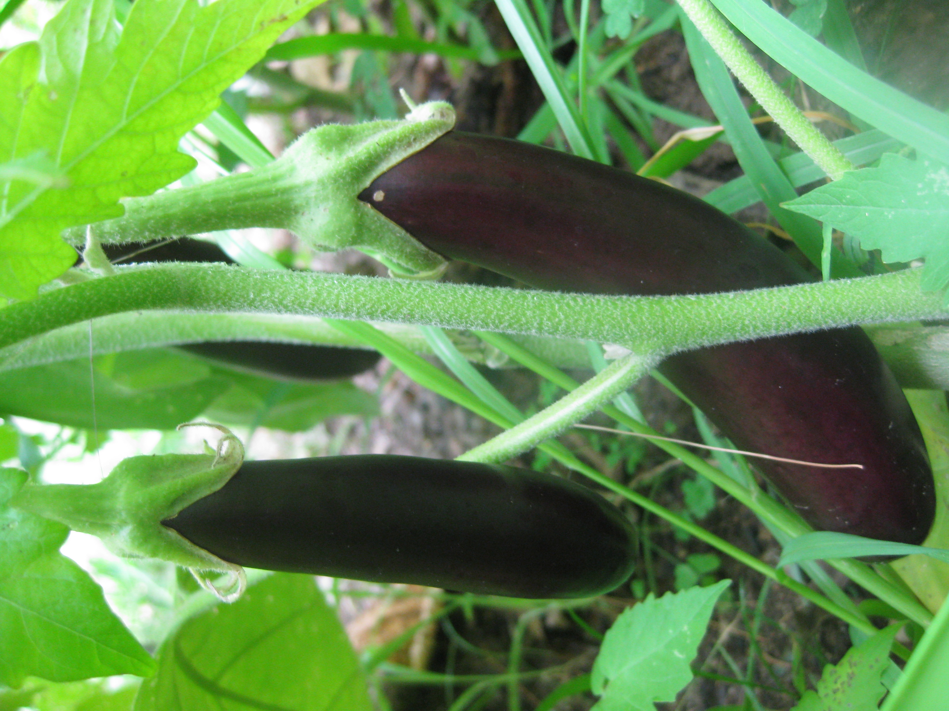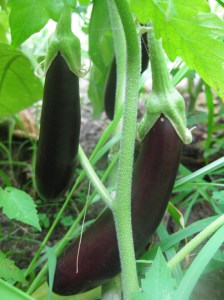 Just as I have cherry tomatoes planted in my home garden to see us through the early part of the summer season before our CSA farm produces sizeable distribution, I also plant miniature eggplants: a beautiful orange globe and a variety called “little fingers” that comes in white and the classic dark shade. The orange ones grow to about 2 inches and the long ones range from 4-6 inches. Although I couldn’t find them this year, I also like the violet and white striped variety that doesn’t grow very large, and the green ones.