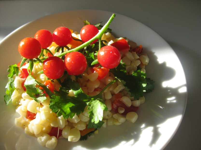 For the corn, cut it off the cob and cook it quickly – in batches — in a small amount of water in a wide pan. My batches are 4-6 ears depending on the size of the ears, so that the corn cooks in 2-3 minutes until warmed and just starting to cook through. Drain the corn, reserving the water and returning it to the pan for the next batch. (BTW at the end, you have a really flavorful corn broth.) Spread the corn as it cooks on a wide platter so that it cools relatively quickly. When cooled to room temperature, toss with the salsa, add a handful of torn cilantro leaves, mound on a platter and serve garnished with cherry tomatoes. The ones I show here are invaders in my garden by the million but very cute and tasty so I tolerate them.