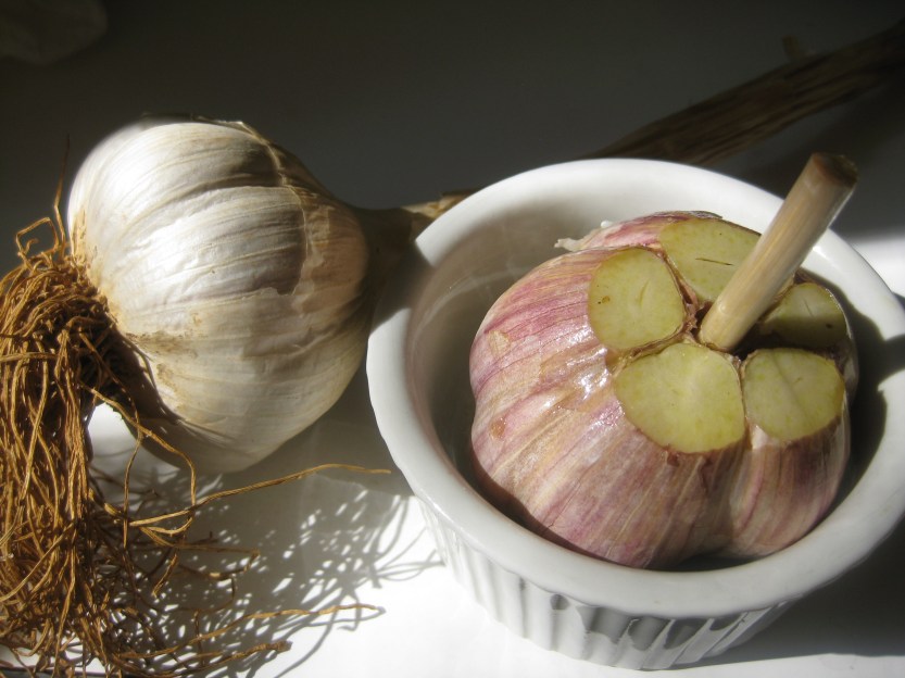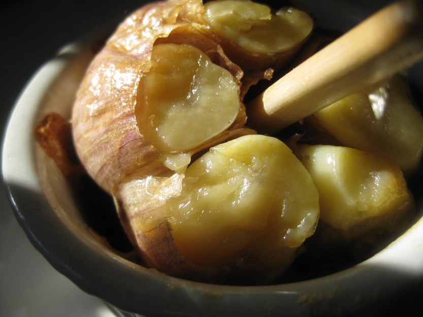 To roast a head of garlic, first trim off the root end so that it sits as flat as possible (but don’t cut into the cloves). Also remove much of the outer skins, to the point of seeing the individual cloves, but leave their skins on as they become wrappers for the meltingly soft garlic that you’ll have left. Cut about 3/8 inch of the top off the entire head of garlic, exposing the ends of the cloves. Stand the garlic head in a small ramekin, sprinkle on a little olive oil, and cover tightly with aluminum foil. (Mine was a little challenge because the stem of the hardneck garlic was so hard that I would have needed tin snips to cut it shorter, which would have been more typical. However, the stem turned out to be a useful handle while I scooped out the cooked garlic pulp.)