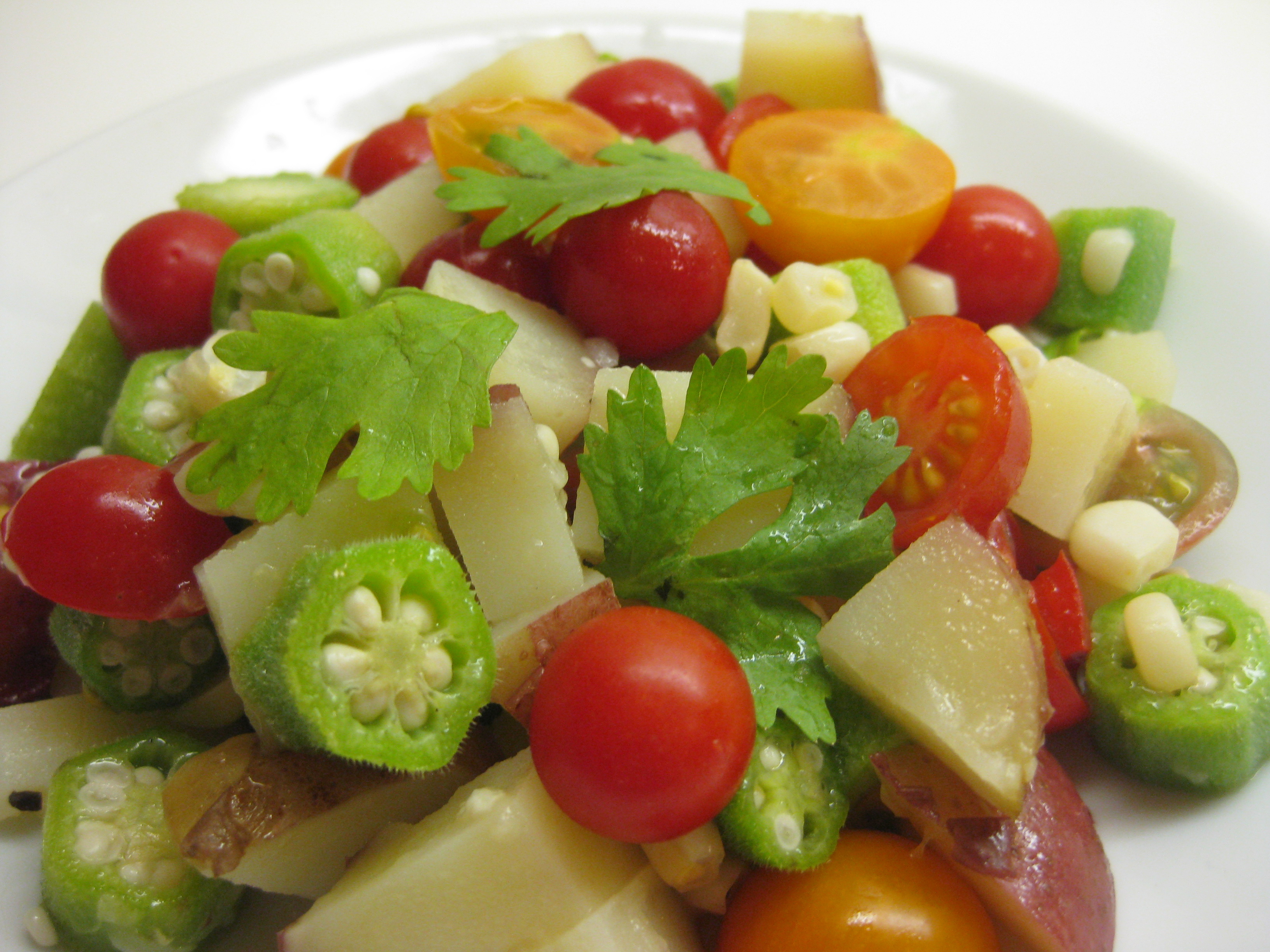 The earliest okra of the season was steamed, tossed into a slightly warm salad of red potatoes, corn, halved cherry tomatoes, chopped red and green peppers, and herbs, lightly salted and dressed with a little olive oil and white wine vinegar. Simple and seasonal.