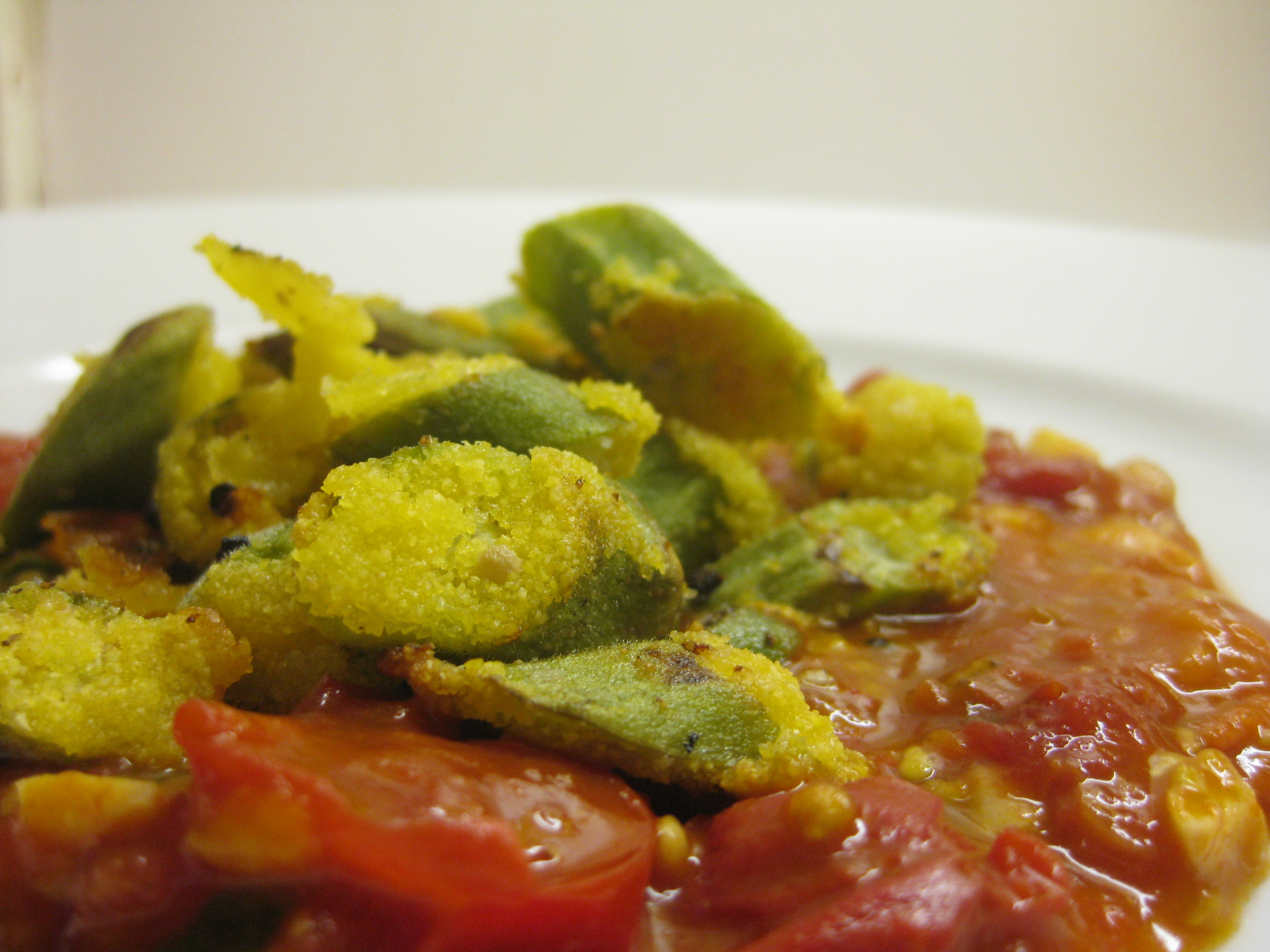 We went on to make a light stew with tomatoes, sometimes with okra being added plain and other times oven-fried and added at the last minute to a tomato-based vegetable stew.