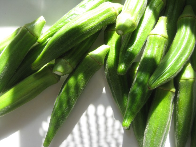 With okra in great supply over the past month, I have been making it in all kinds of ways, often combining it with corn and tomatoes. Some people object to the texture of okra, which can get gelatinous. I harvest my own, between 2-4 inches and cook it soon afterwards, and it’s not gooey at all. I think the trick is to use very fresh vegetables and to prepare them quickly and simply, except in the case of gumbo. This Part 1 covers some steaming, some stewing and some oven-frying. Future posts will cover gumbo, fritters and even pickles!