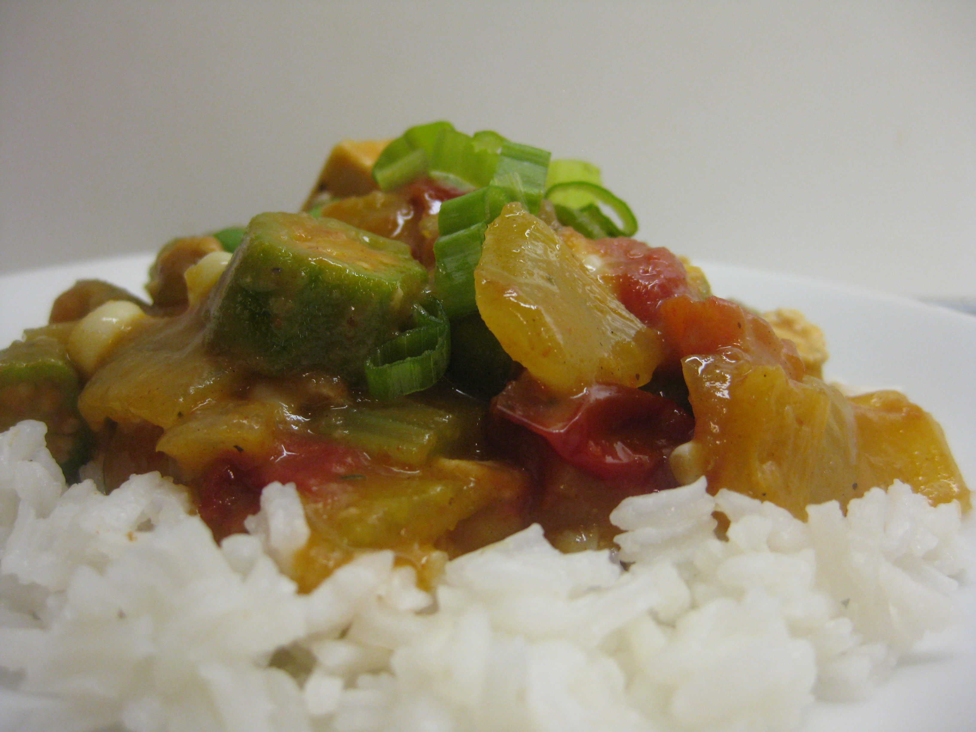 Substitute fish or shrimp stock (or bottled clam juice and water) for the chicken broth. Substitute fish and/or shrimp for the chicken, and add it to the stew when you add the okra. Corn and sausage are optional.