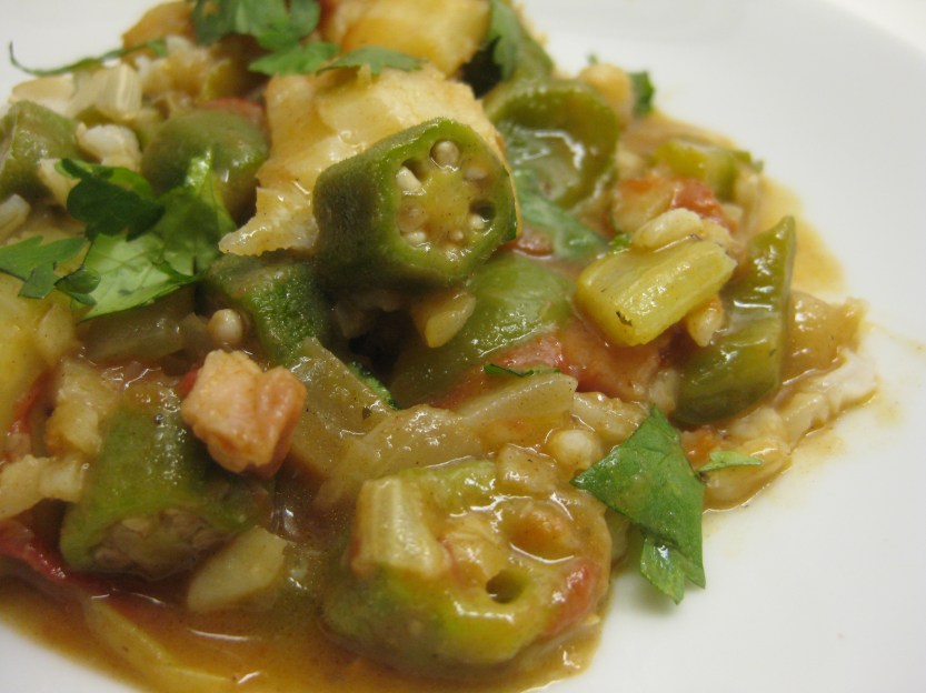 After the steamed and fried okra served as sides and the pancakes as a main course, we made gumbo. Three ways: with chicken, with fish and a vegetarian version. Gumbo is basically a stew with a dark roux base (flour cooked in oil until very dark brown, like an over-cooked gravy base), stock (chicken, fish, vegetable), poultry or fish with or without some andouille sausage, and okra. I like to add tomatoes and corn to mine, and garnish with cilantro, but I’m probably not making it authentically. Traditionally served with rice, all versions were delicious.