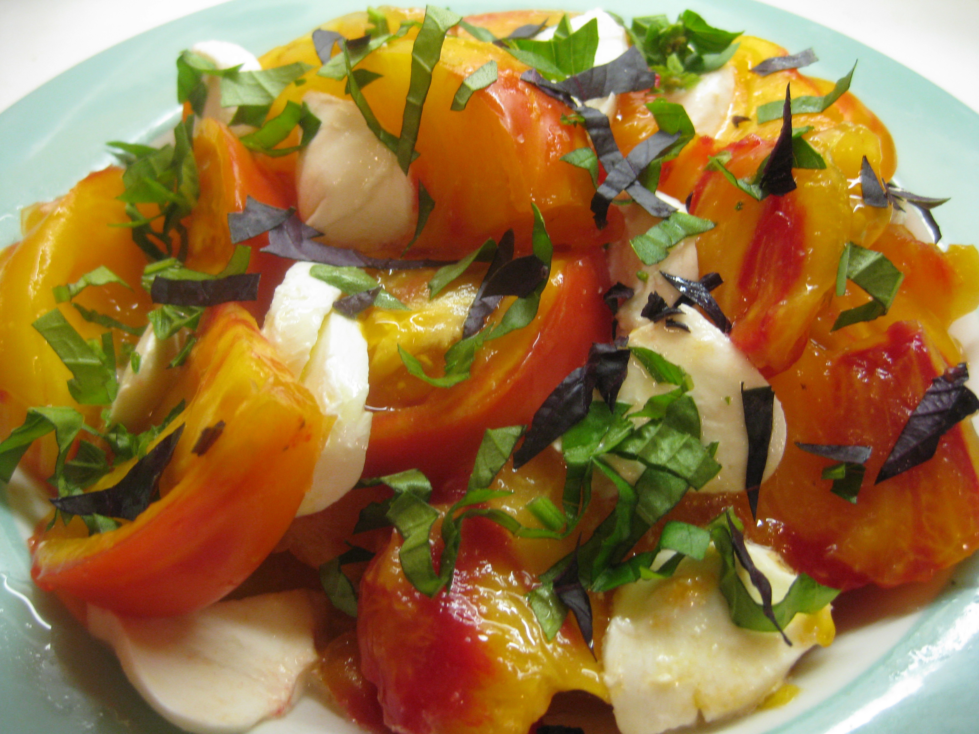 Here is a scrumptious German striped tomato, grown in my own garden, a yellow giant with red stripes bleeding into the golden flesh like watercolor on paper, served simply with the best olive oil and sea salt, a few melting morsels of mozzarella strewn with color counterpoints of green and violet basil snipped just steps from my kitchen door. Just so.