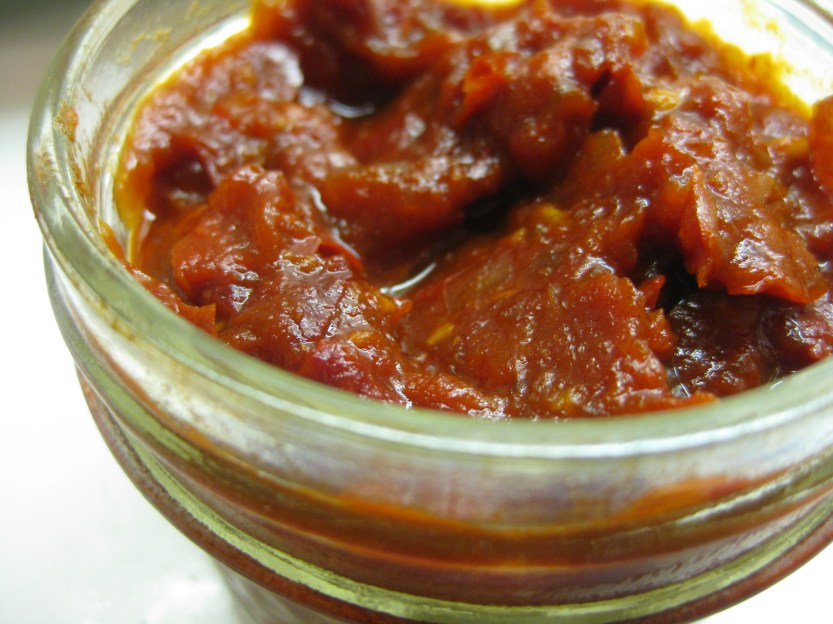 I didn’t get around to posting the hot sauce for the October series of the Tigress Can Jam that focused on capsicums but it would have been a good candidate since it’s based on New Mexico chile peppers combined with tomatoes, onion and garlic and reduced to a thick paste. The recipe came from the Ball Complete Book of Home Preserving, where it’s titled “Harissa Sauce.” I re-named it since it’s hardly harissa, given the addition of the tomatoes and spices.