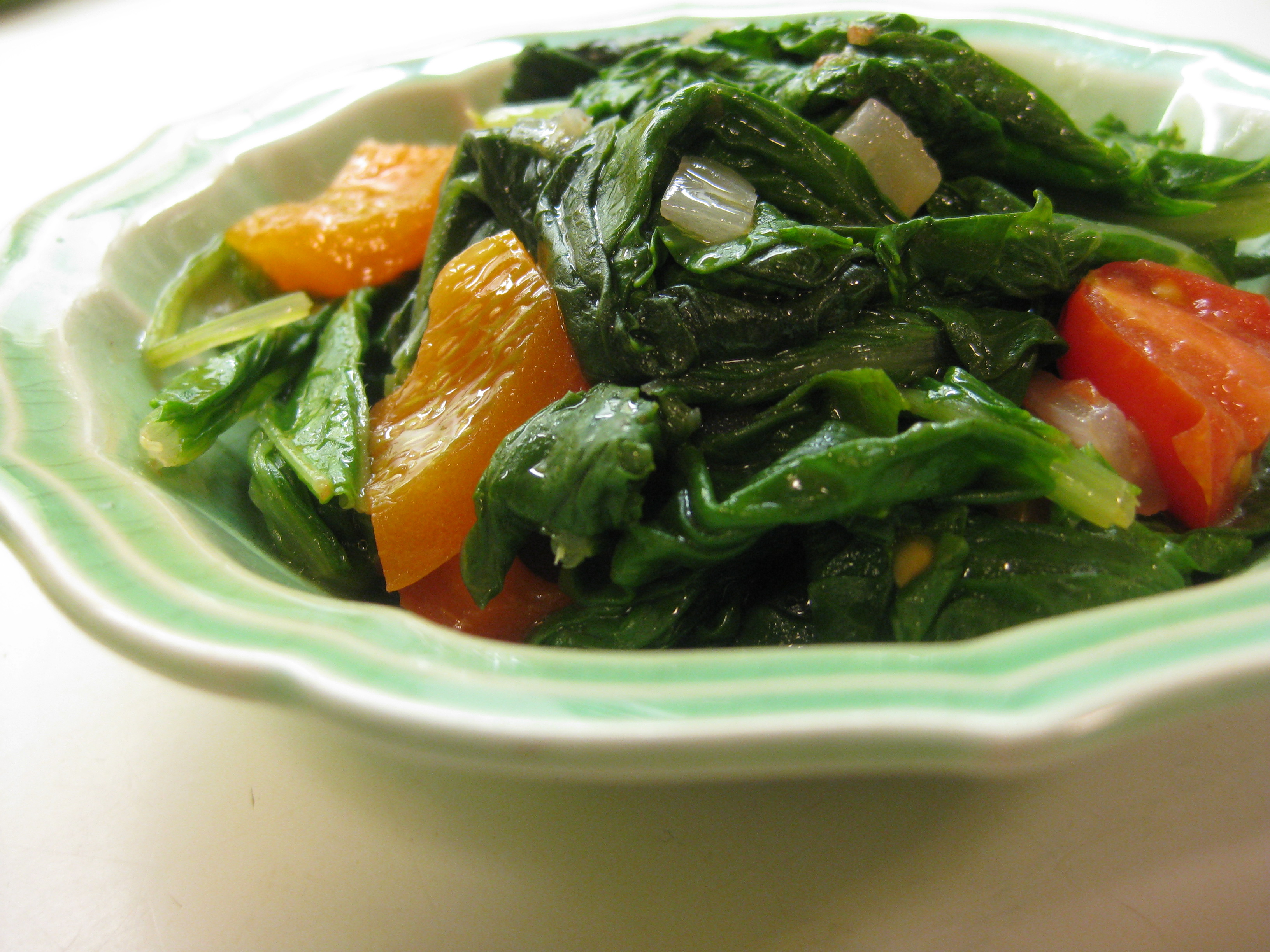 Here are two of countless ways of cooking these bitter greens. The first technique, which I’ve typically used with mustard greens, involves onions, garlic, and chopped peppers and tomatoes, the last of the season. Saute chopped onion and garlic in a little olive oil and add the peppers, cooking until softened. Then add chopped tomatoes (a good way to use up the last cherry tomatoes of the season) and cook slightly. Add the washed greens and cook, stirring, over medium heat until the greens are wilted, adding a little water if necessary (not much since it will dilute the taste). Season with salt and pepper and serve hot.