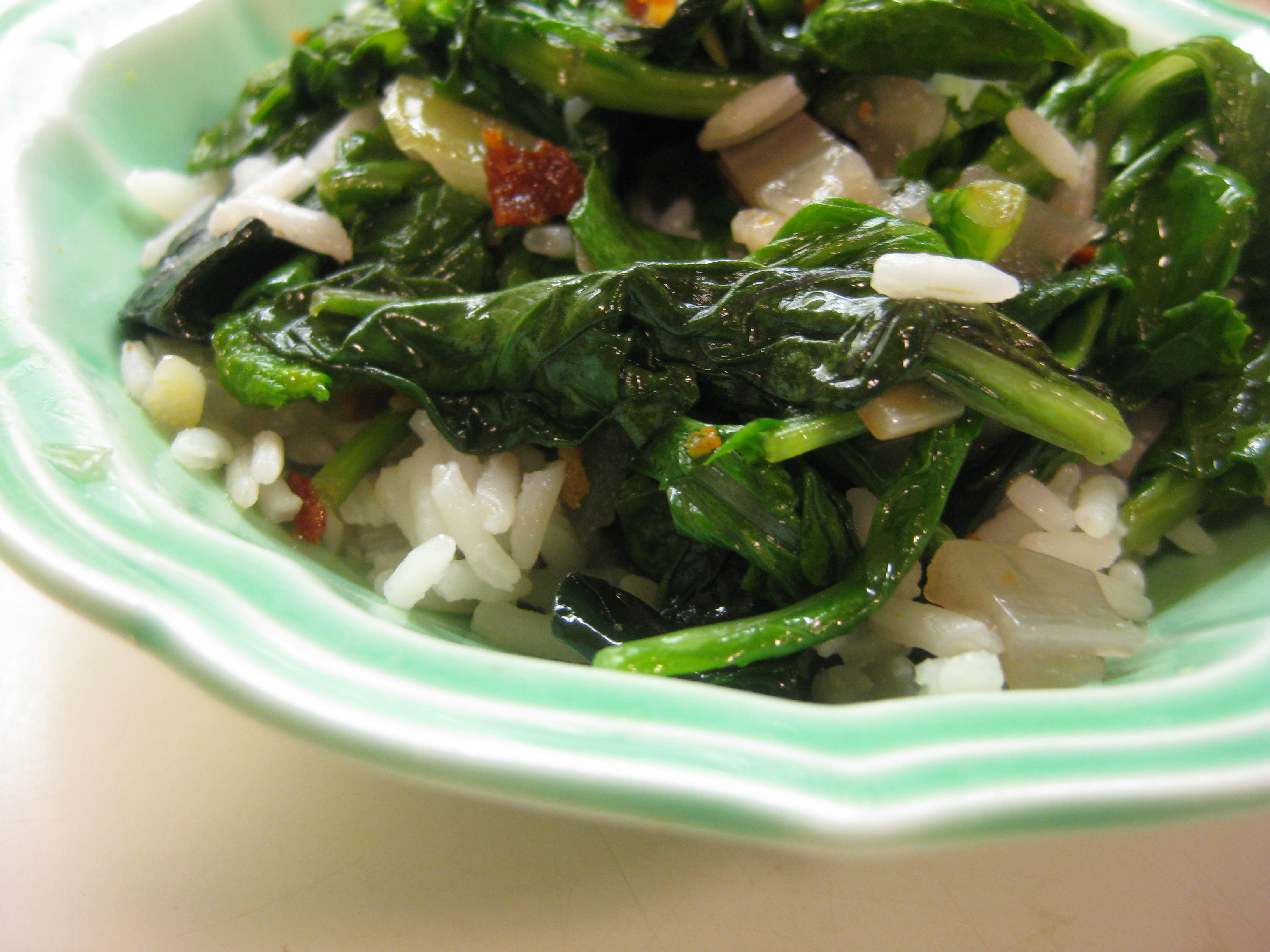 The second uses bacon and cider vinegar. For greens that are to be wilted and eaten raw, I normally cook a small batch of bacon, remove it to crisp, and then sauté onions in the bacon grease, adding cider vinegar to deglaze the pan. With a touch of sugar, this becomes a dressing that is poured over fresh greens. My braising mix was a little strong for a salad, so I added the greens to the mix after the onions had softened a bit and garnished with the reserved bacon. I also added a little pre-cooked rice to make this a more substantial meal.