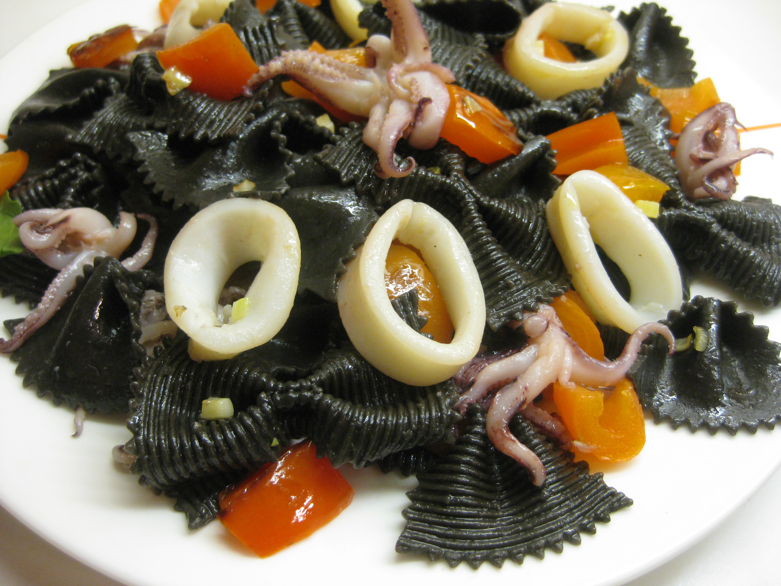 Actually, this is a remarkably good pasta dish, a version of a delicious pairing that I ate in a North Beach restaurants in San Francisco a couple of weeks ago. That one involved homemade squid ink pasta with a delectable medley of shellfish in a garlicky wine sauce. For this one, I lightly cooked orange peppers and calamari (squid) in olive oil and garlic and served them mixed with a premium Italian brand of squid ink farfalle. It may look ghoulish but it sure was delicious.