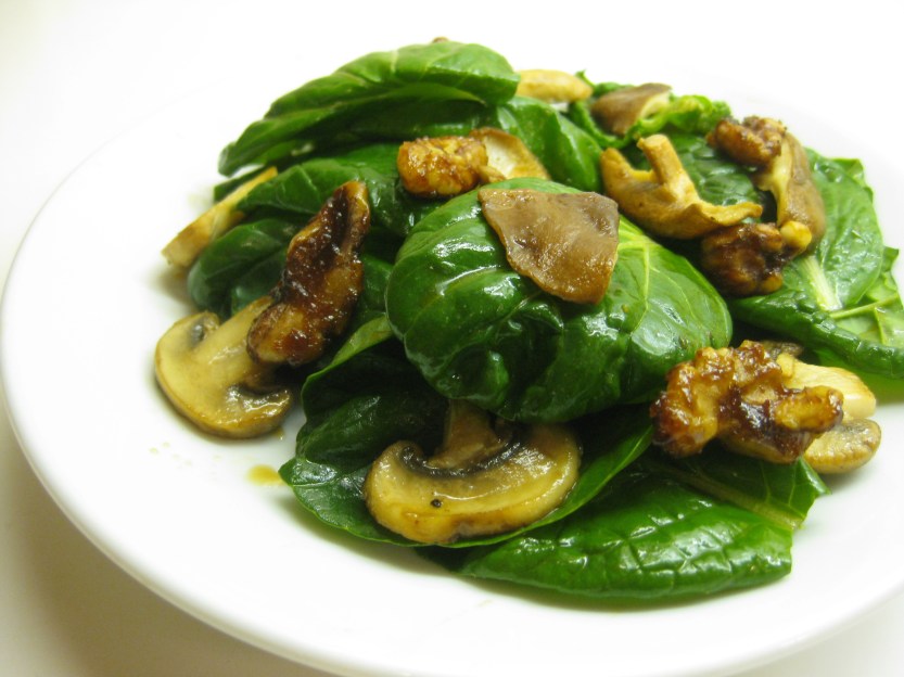 I dressed the tatsoi leaves with an Asian-inspired dressing of brown rice vinegar and touches of toasted sesame oil and tamari. I heated the walnuts in a little oil and stirred in hoisin sauce (or I could have used the sweet soy sauce known as kecap manis), cooking until crisp. I served the salad with roasted pumpkin and pears, which were great as counterpoints and complemented the colors and nutritional value. Yum fall food.
