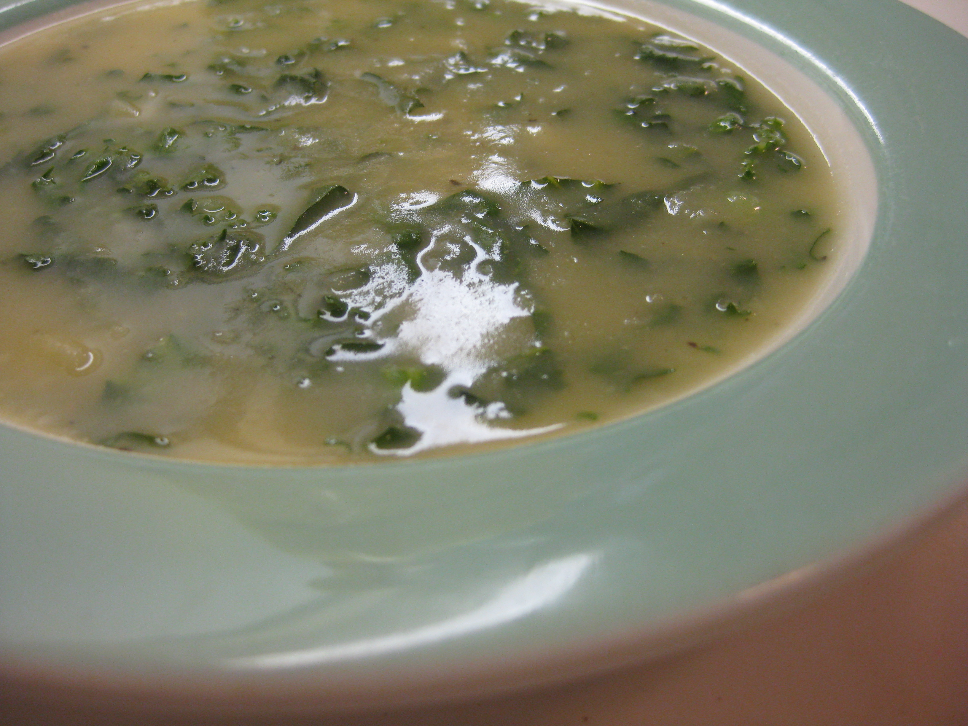 Saturdays are always hectic around here, when we’re rushing around to take care of a week’s errands, running off to the CSA farm to pick up our weekly share and pick whatever’s available from the fields, cleaning the house and attending various events. Phew. So this weekend, when we were cleaning out our gardens for the final time and chopping up leaves for the compost heap, I made this simple and flavorful soup that used up some of our abundant kale. I made it with chicken broth that had been simmered with a smoked ham hock from my freezer, which imparted a smoky flavor. The more traditional – Portuguese –version would be to add chorizo. The soup could be made vegetarian simply by using vegetable stock, or even water. I chose to puree the potatoes but if you cut them small and neatly, they can be left whole, creating a rather different kind of soup.